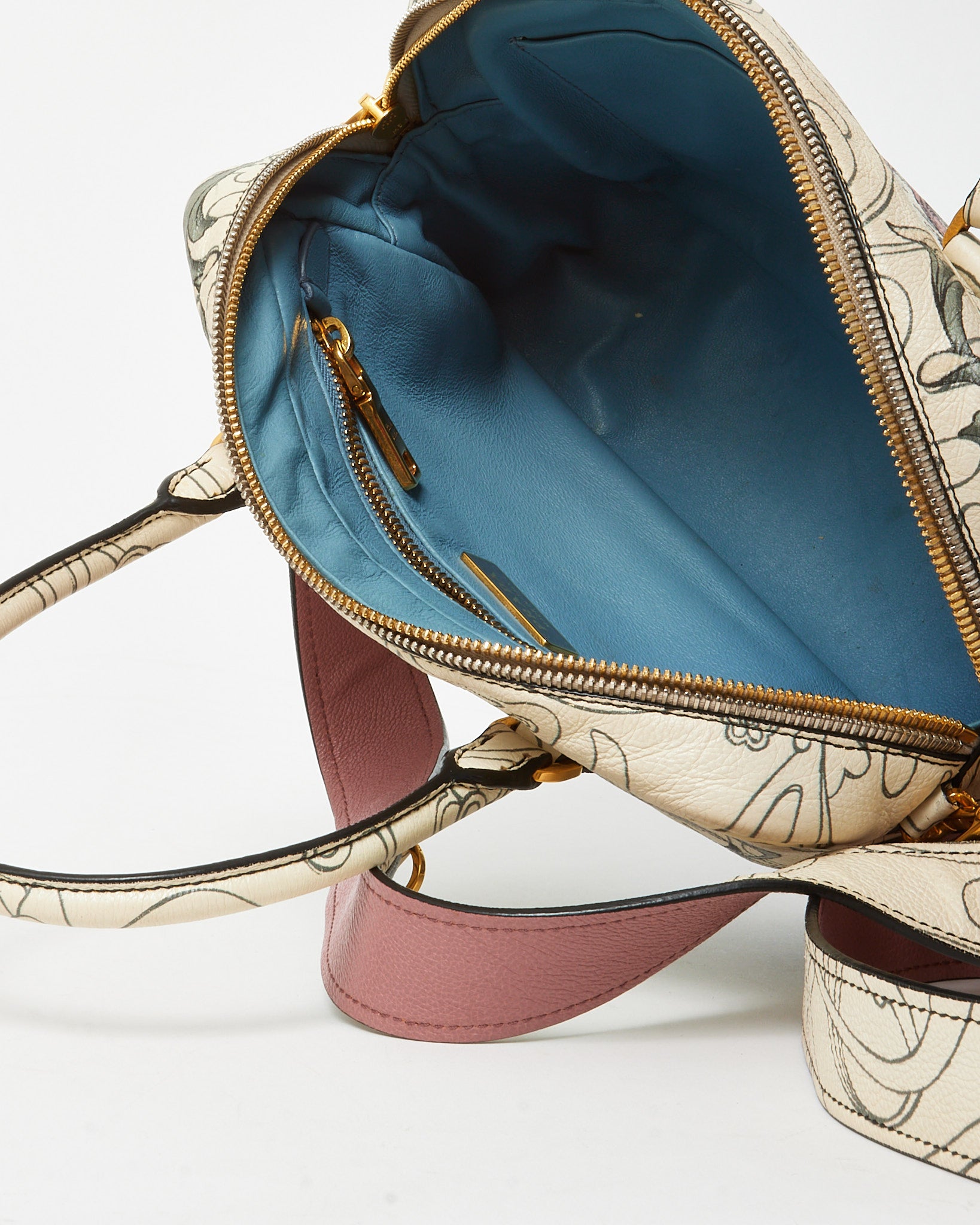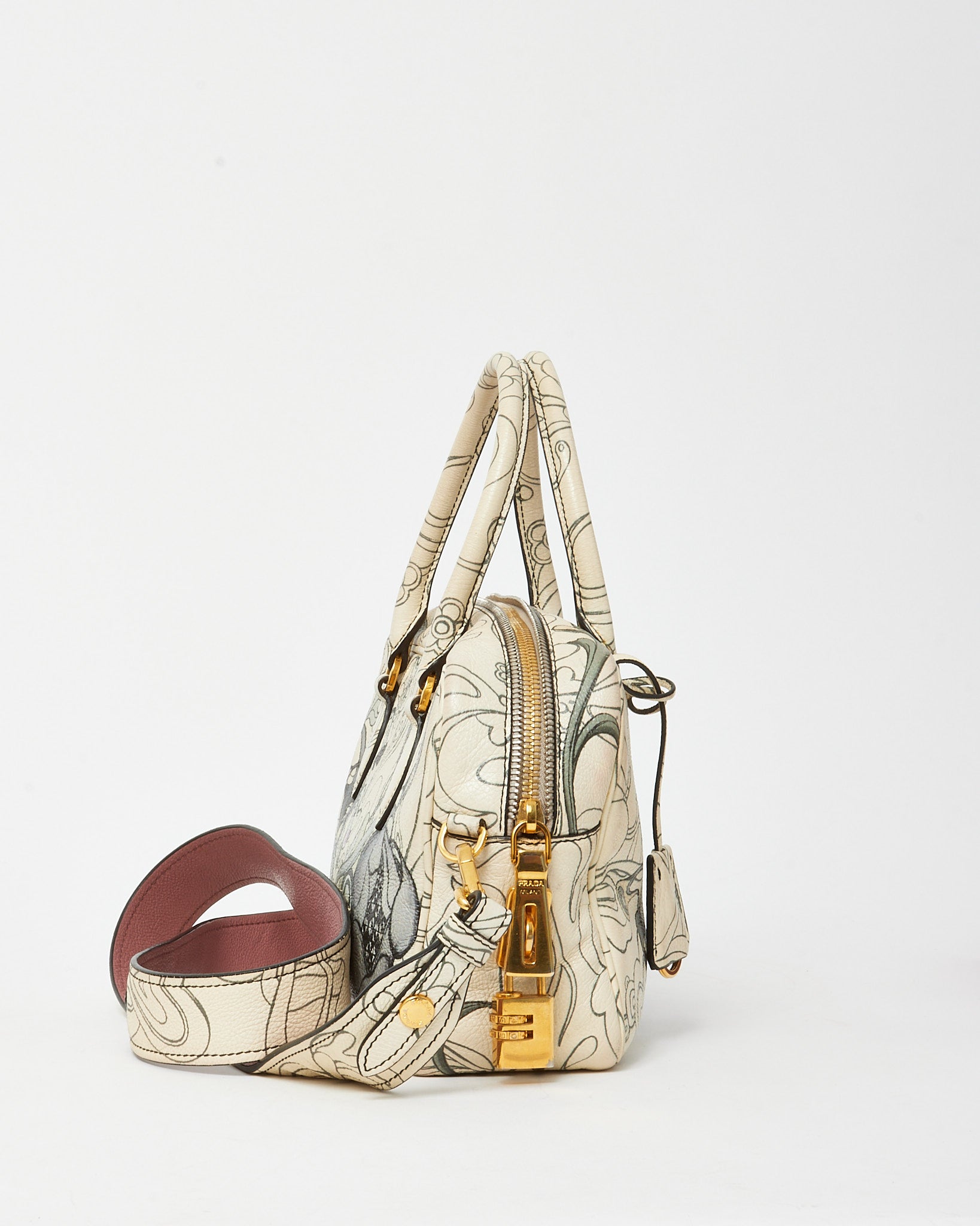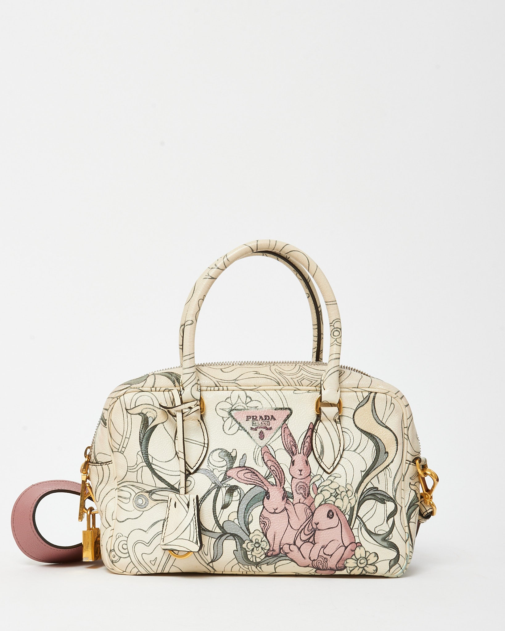 Make a collectible statement with this pre-loved authentic Prada x James Jean Limited Edition White Opaline Glace Calfskin Rabbit Print Bauletto Top Handle Bag with Strap, crafted in smooth opaline glace calfskin leather for a sleek, luminous finish. The classic Bauletto silhouette is elevated with a whimsical rabbit print by artist James Jean, blending art and fashion in a truly unique design. Featuring structured top handles and a detachable strap for versatile carry, this Prada bag offers both style and functionality with a spacious interior for essentials. A rare designer piece that combines limited-edition artistry, Italian craftsmanship, and modern luxury appeal.