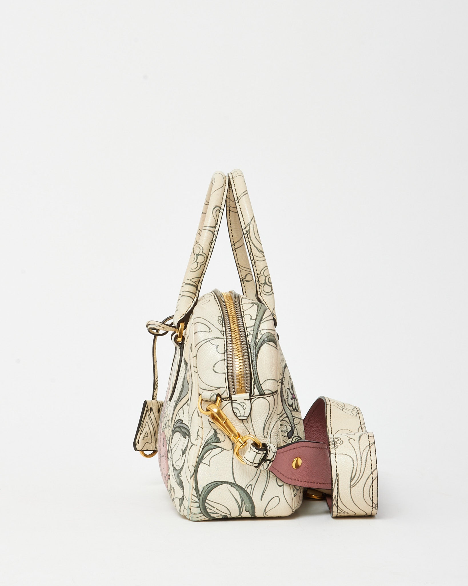 x James Jean Limited Edition White Opaline Glace Calfskin Rabbit Print Bauletto Top Handle Bag with Strap