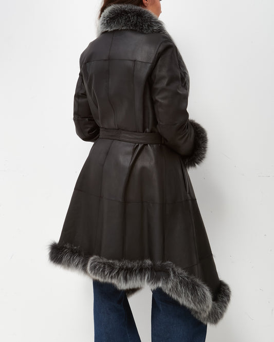 Wrap yourself in elegance with this pre-owned authentic Holt Renfrew wrap coat, crafted from supple black leather and luxuriously trimmed with voluminous silver fox fur. The dramatic shawl collar, cascading fur-trimmed edges, and belted waist create a statement silhouette that blends warmth with sophisticated flair. Fully lined in plush shearling, this mid-length coat delivers comfort and polish in equal measure. Perfect for winter outings, it’s an opulent cold-weather essential that turns heads while keeping you cozy.