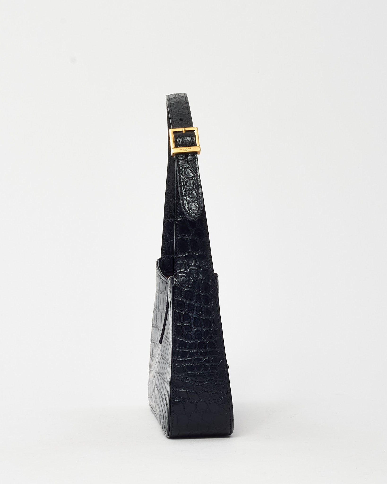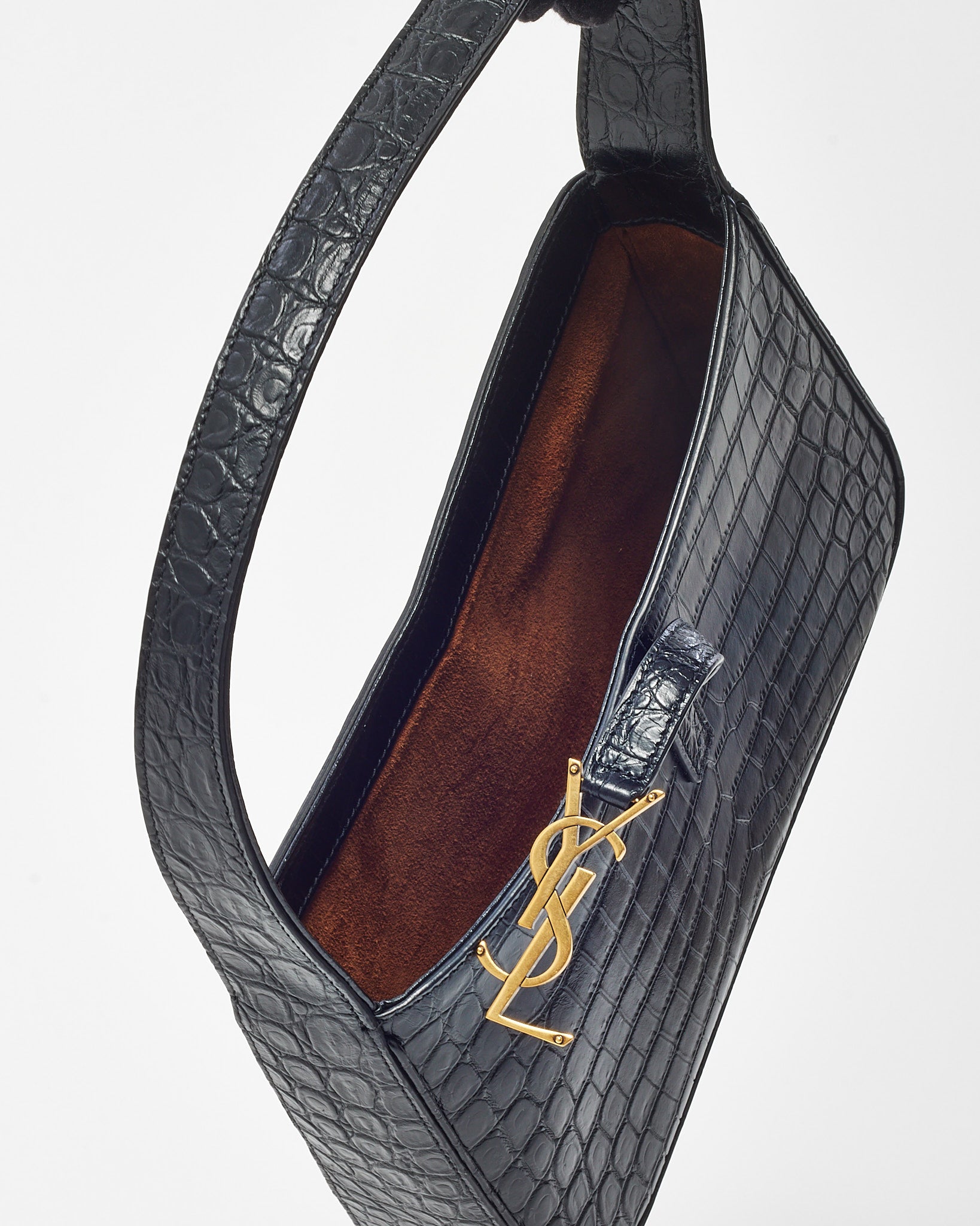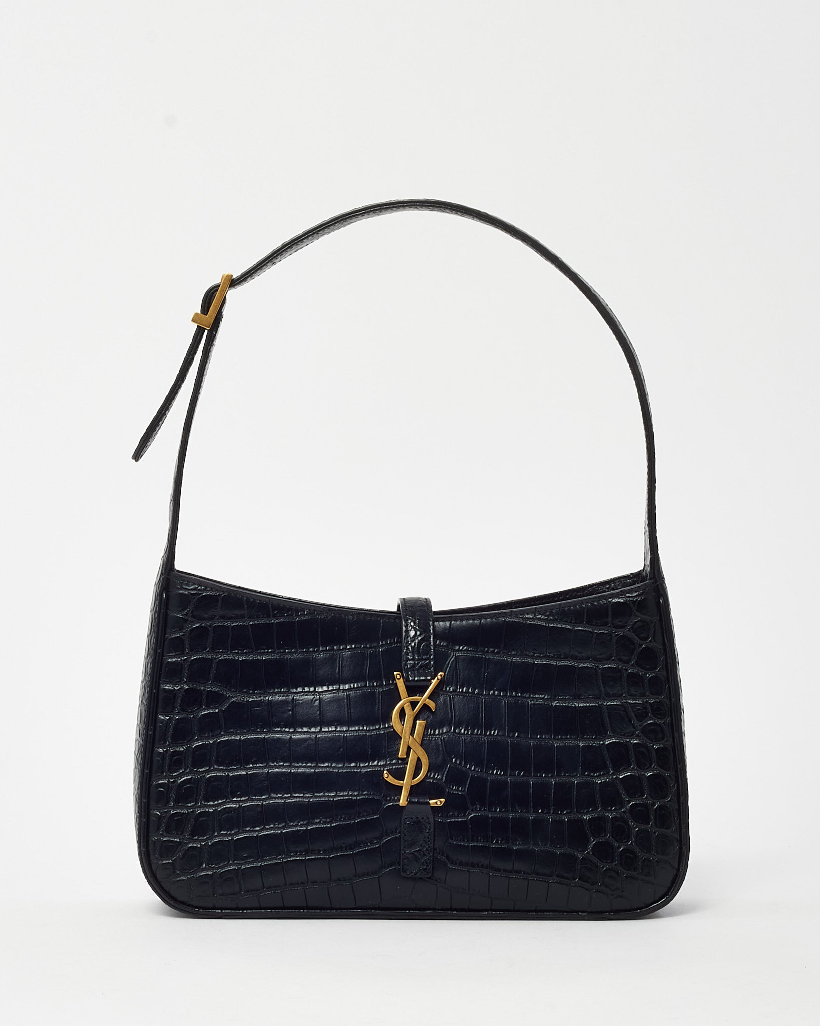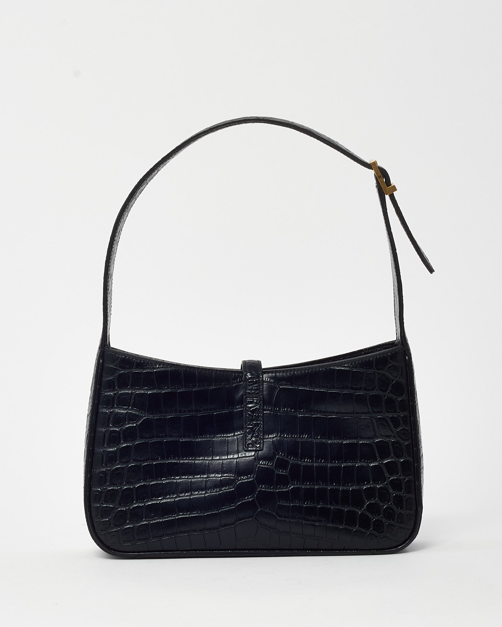 Refined and effortlessly cool, this pre-loved authentic Saint Laurent 5 À 7 Shoulder Bag is crafted from black croc-embossed leather for a sleek, textural finish. The curved silhouette and structured body are complemented by a tonal YSL logo plaque and a flap top with magnetic closure. Designed for day-to-night versatility, the compact interior holds essentials with ease, while the adjustable leather strap allows for comfortable shoulder carry. A modern classic with timeless appeal, this YSL bag embodies understated luxury and Parisian edge.