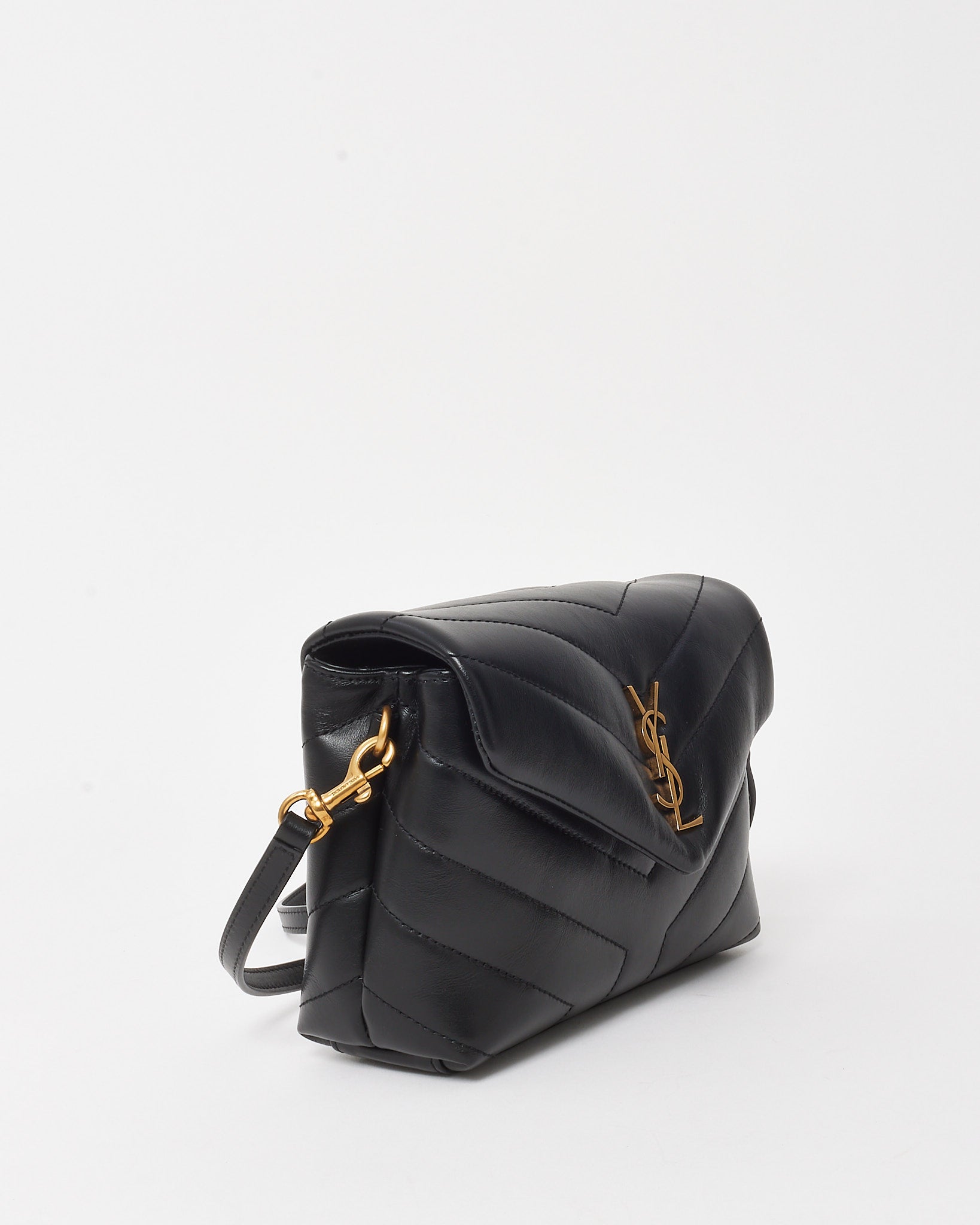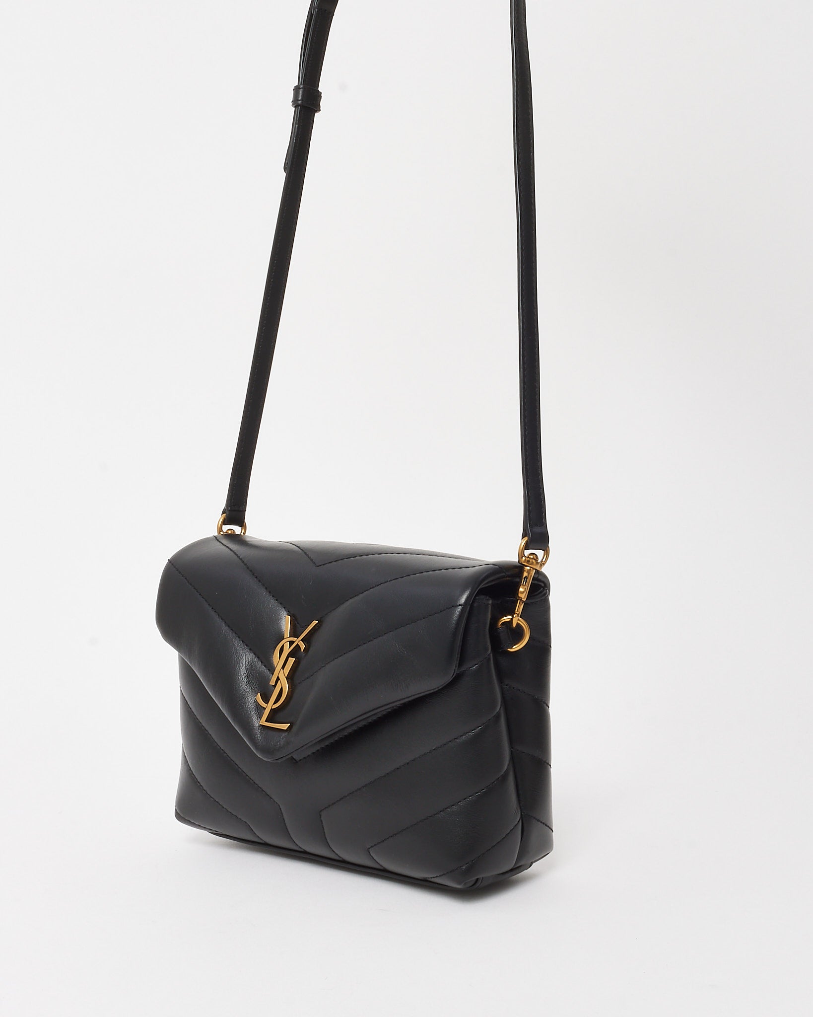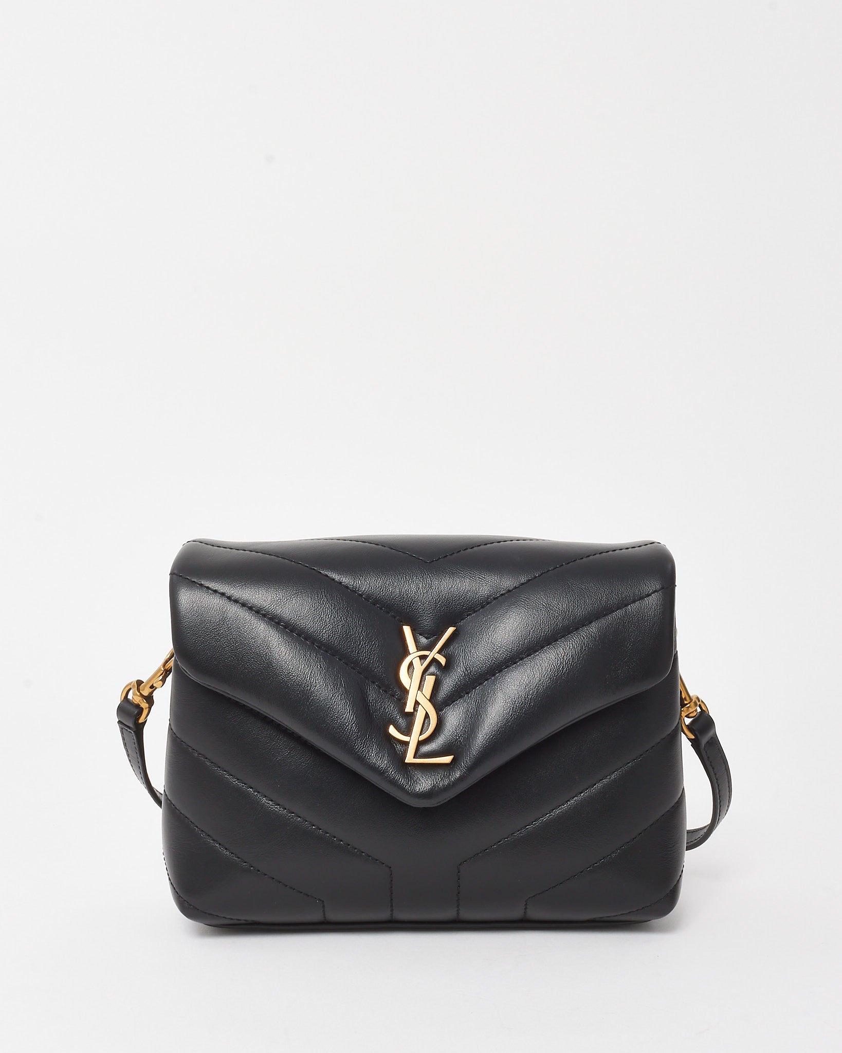 A modern icon in mini form, this pre-loved authentic Saint Laurent Toy LouLou bag is crafted from supple black matelassé leather with chevron quilting for a structured yet soft silhouette. Accented with gold-tone hardware, including the signature YSL monogram on the front flap, it exudes timeless Parisian elegance. The compact interior is lined and divided for daily essentials, while the adjustable leather strap allows for both shoulder and crossbody wear. Perfect for elevating everyday looks or transitioning seamlessly into evening.