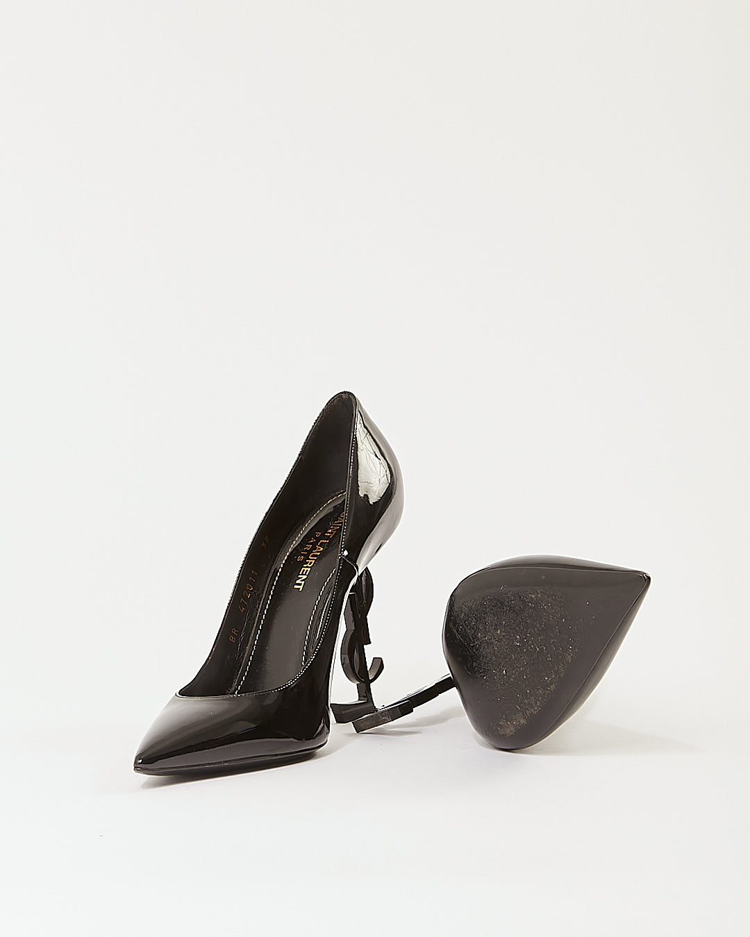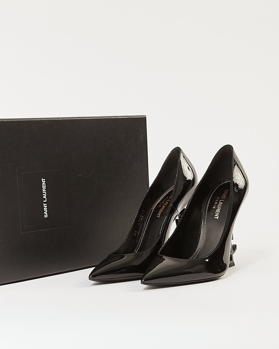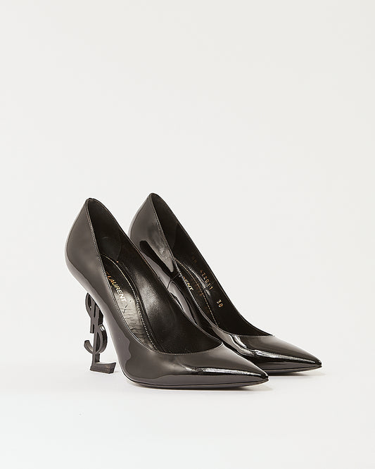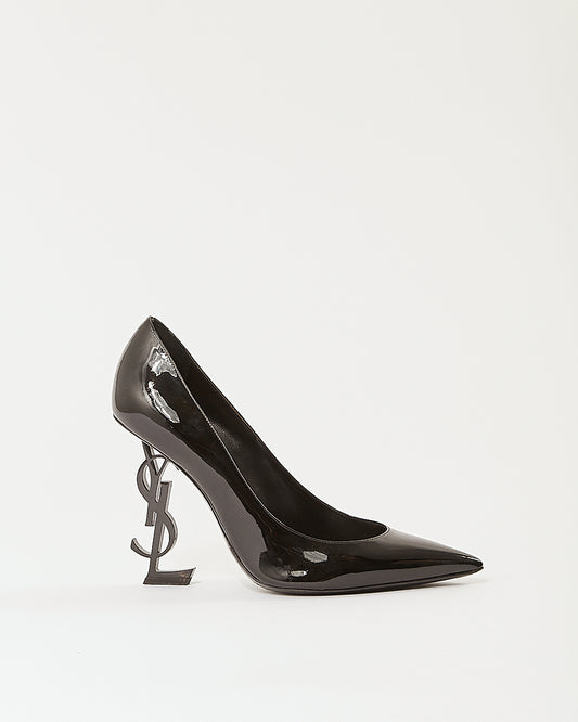 Black Patent Leather Logo Heel Point Toe Pumps - 38