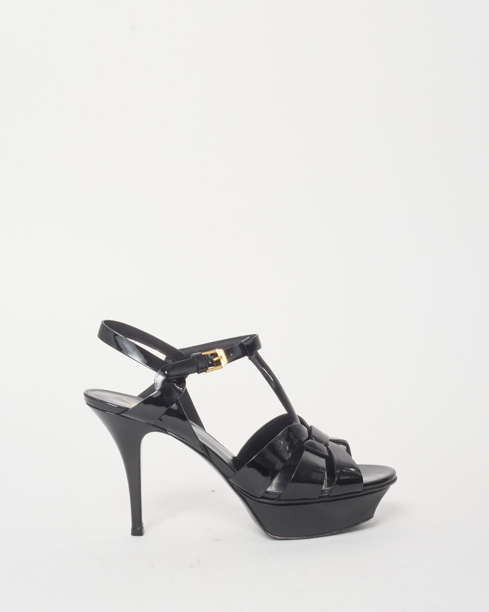 Elevate your style with these authentic pre-owned YSL Saint Laurent Black Patent Leather Tribute 115 MM Sandals in size 38.5. Known for their timeless appeal, these iconic sandals feature a sleek patent leather design with intertwining straps and a towering stiletto heel. Perfect for glamorous events, these sandals embody the sophistication and boldness of Saint Laurent. Black high-gloss black patent leather, supportive platform for comfort, intertwining straps with an adjustable ankle buckle for a secure fit. Leather sole for added elegance and durability. Shop pre-owned authentic Saint Laurent heels and shoes at Retyche.