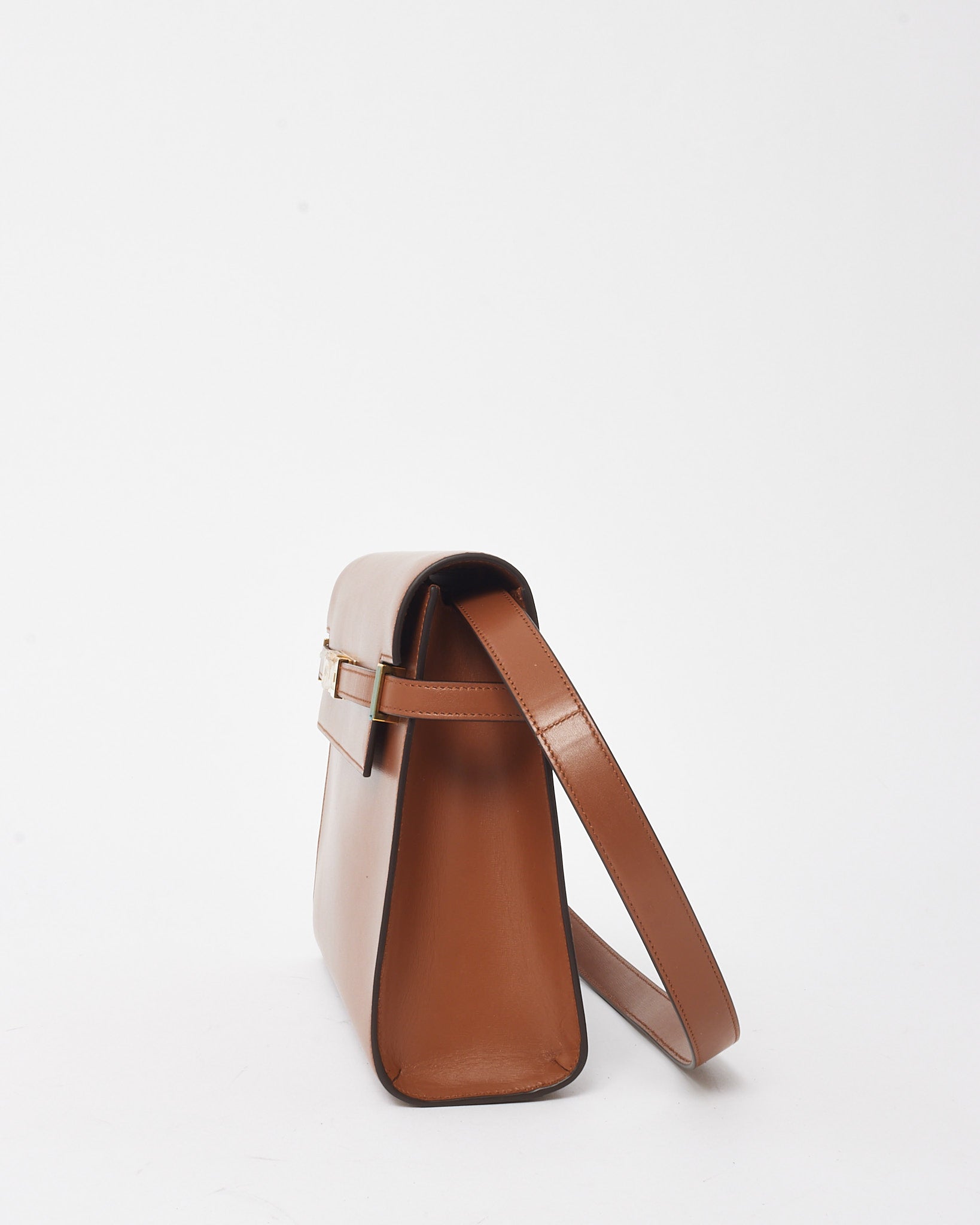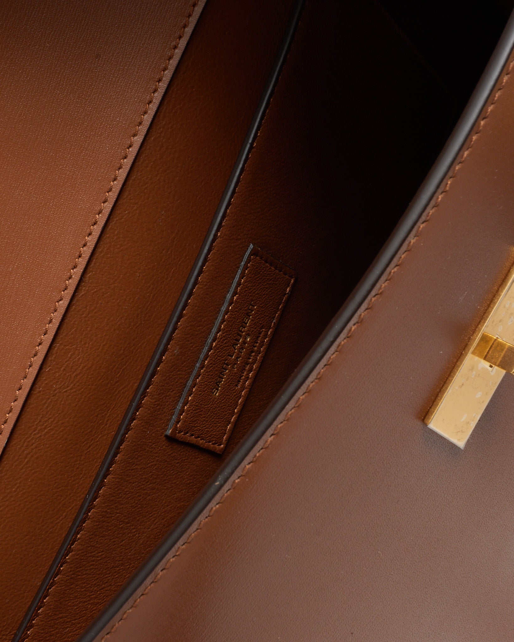 Elevate your wardrobe with this pre-loved authentic Saint Laurent Manhattan shoulder bag, a refined essential in rich cognac brown smooth calfskin leather. Structured and sleek, the medium-sized silhouette features a tonal flap accented by a minimalist gold-tone clip buckle, evoking understated sophistication. A subtle embossed Saint Laurent logo at the front adds a quiet signature touch. Finished with an adjustable shoulder strap for tailored wear, this timeless piece transitions effortlessly from business to evening, embodying modern elegance with Parisian polish.