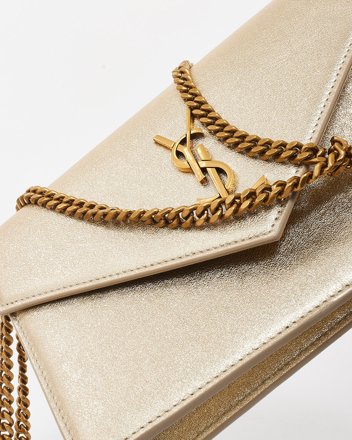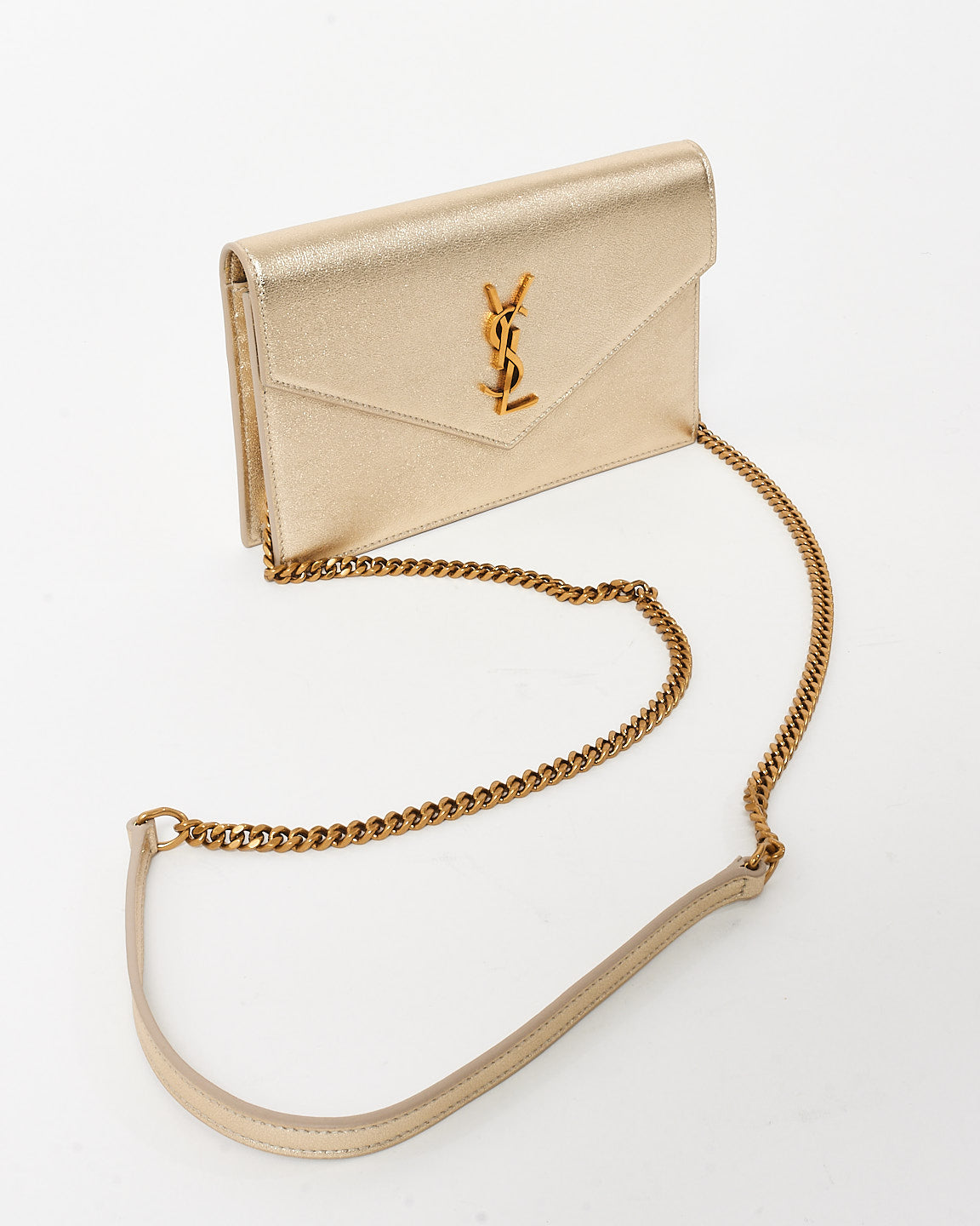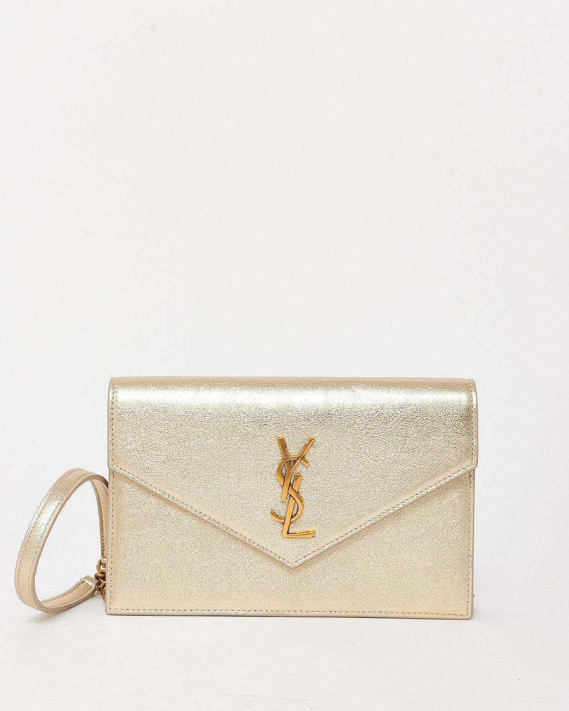 Effortlessly glamorous, the authentic pre-owned Saint Laurent Gold Leather Cassandre Wallet On Chain is the perfect accessory for day-to-night elegance. Crafted from luxurious gold leather, this sleek piece features the iconic YSL Cassandre logo in polished gold-tone hardware, exuding timeless sophistication.