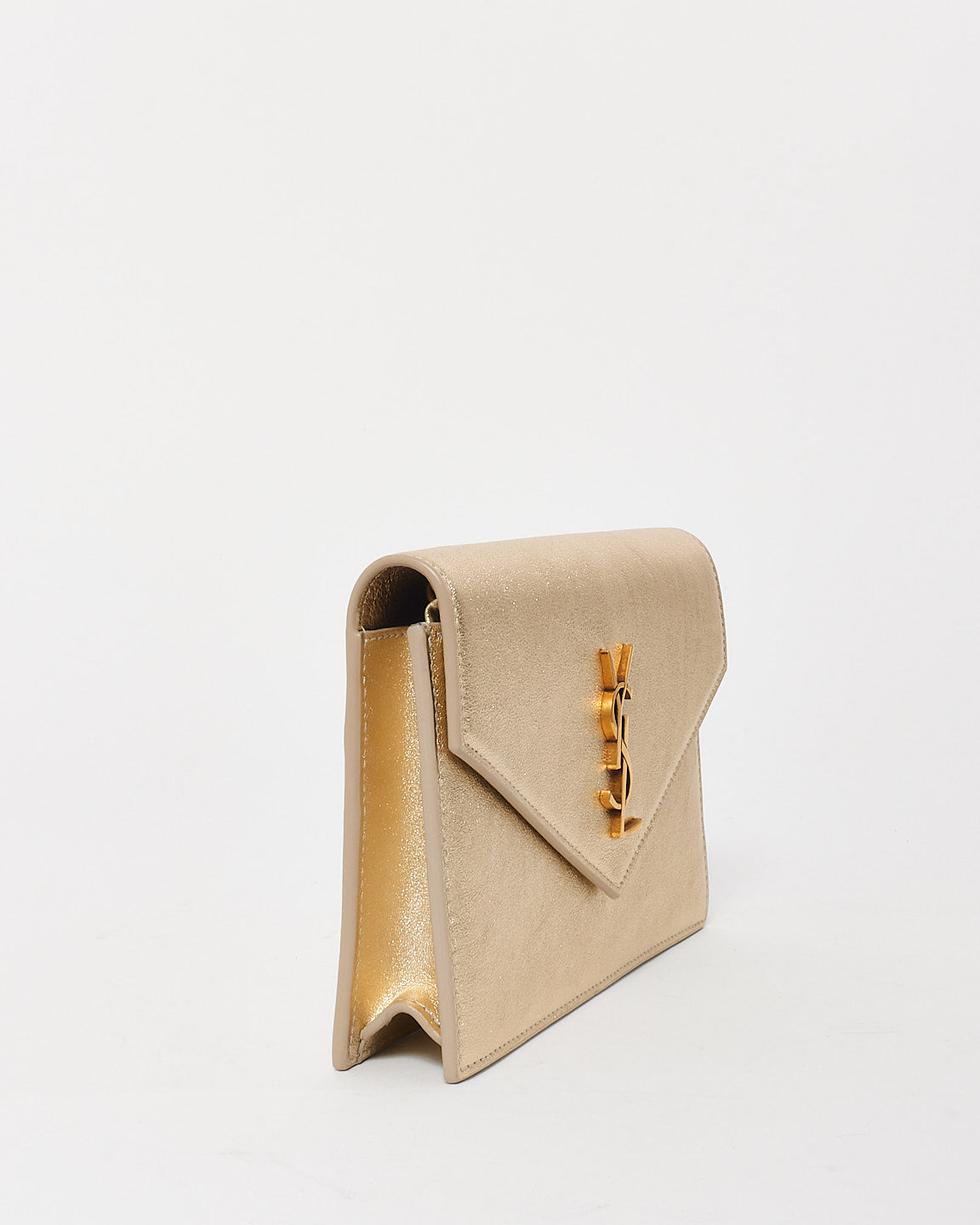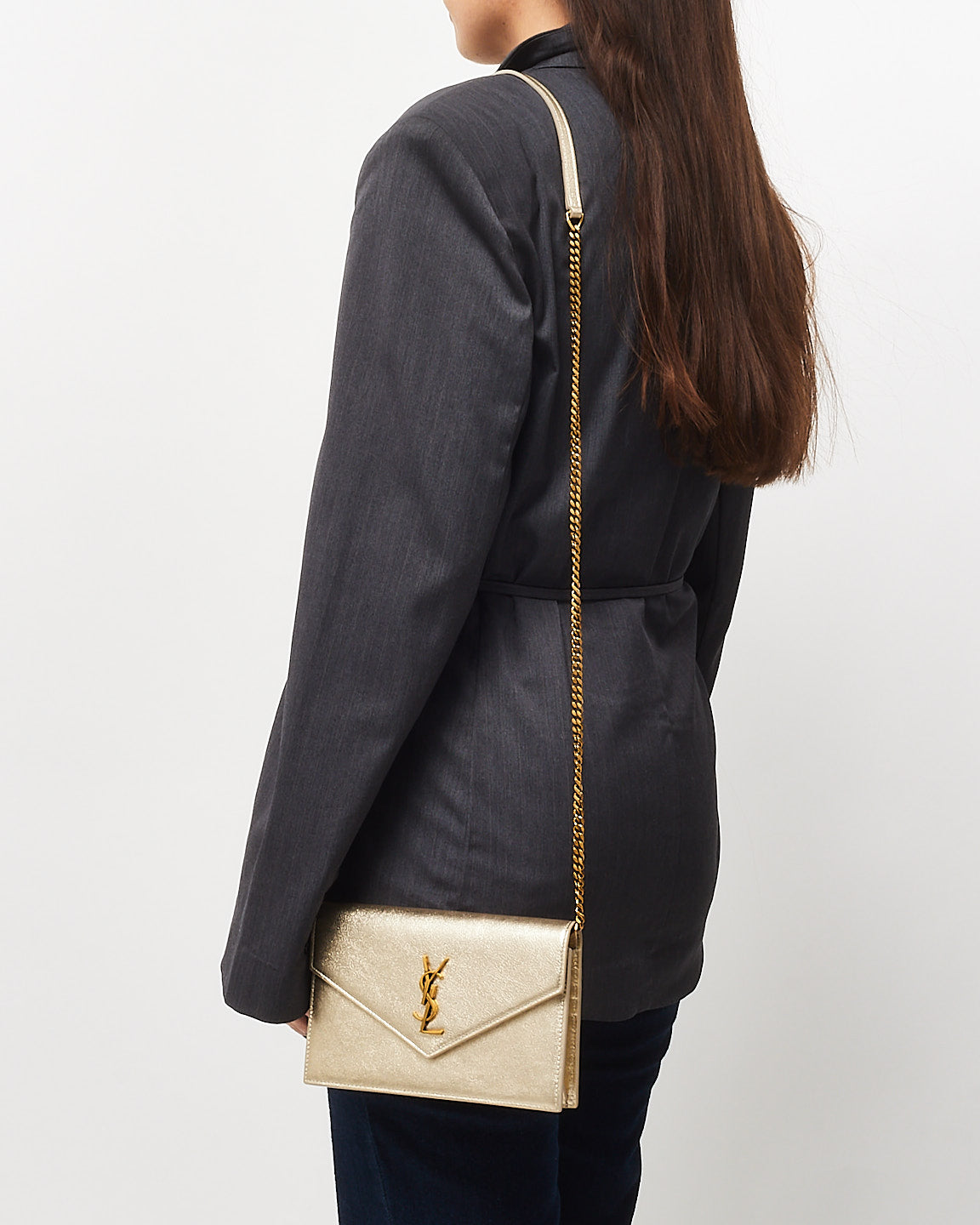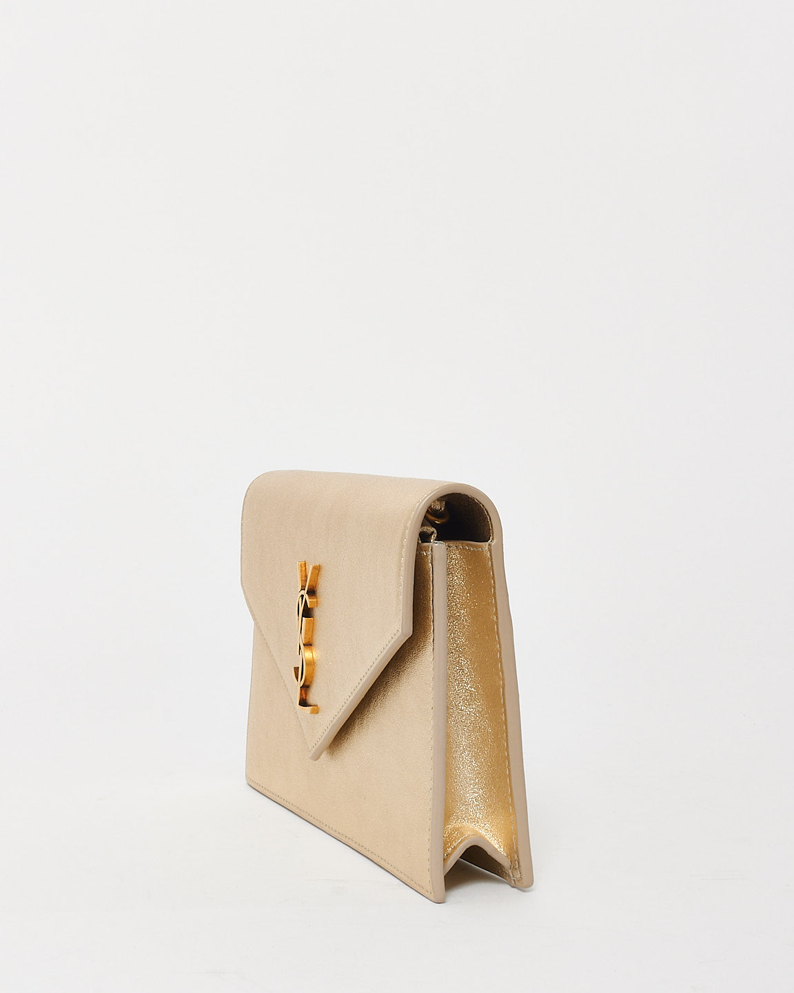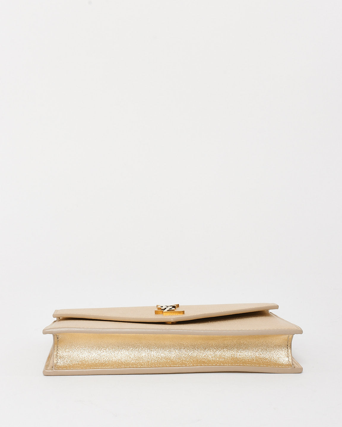 Effortlessly glamorous, the authentic pre-owned Saint Laurent Gold Leather Cassandre Wallet On Chain is the perfect accessory for day-to-night elegance. Crafted from luxurious gold leather, this sleek piece features the iconic YSL Cassandre logo in polished gold-tone hardware, exuding timeless sophistication.