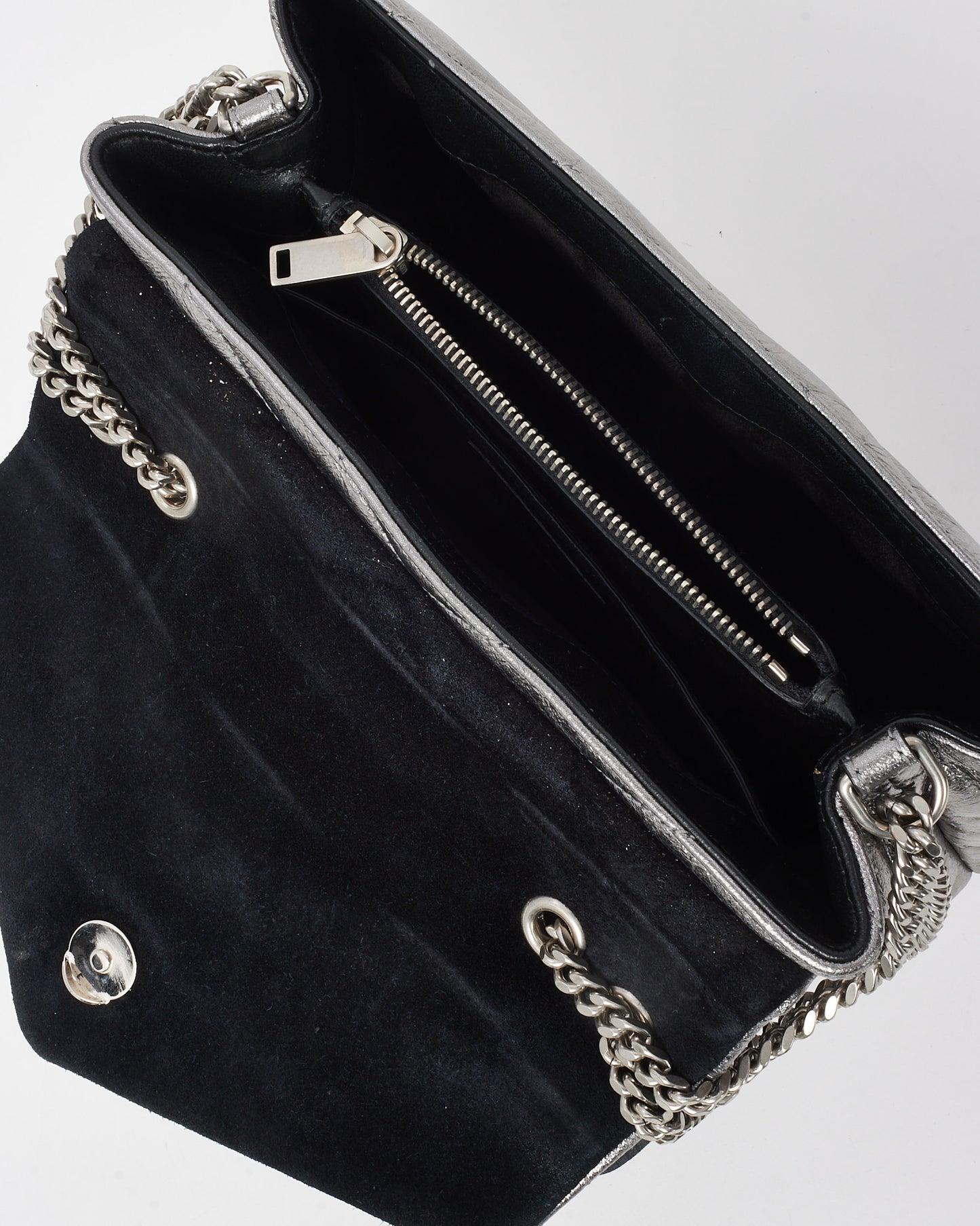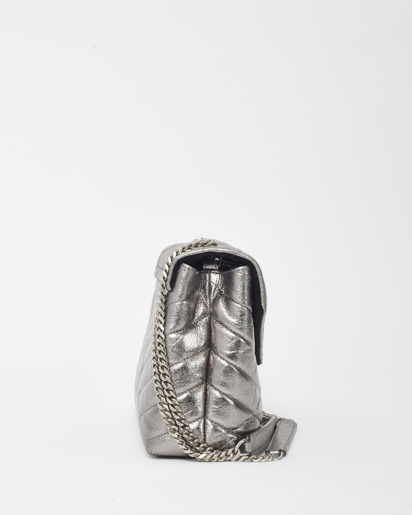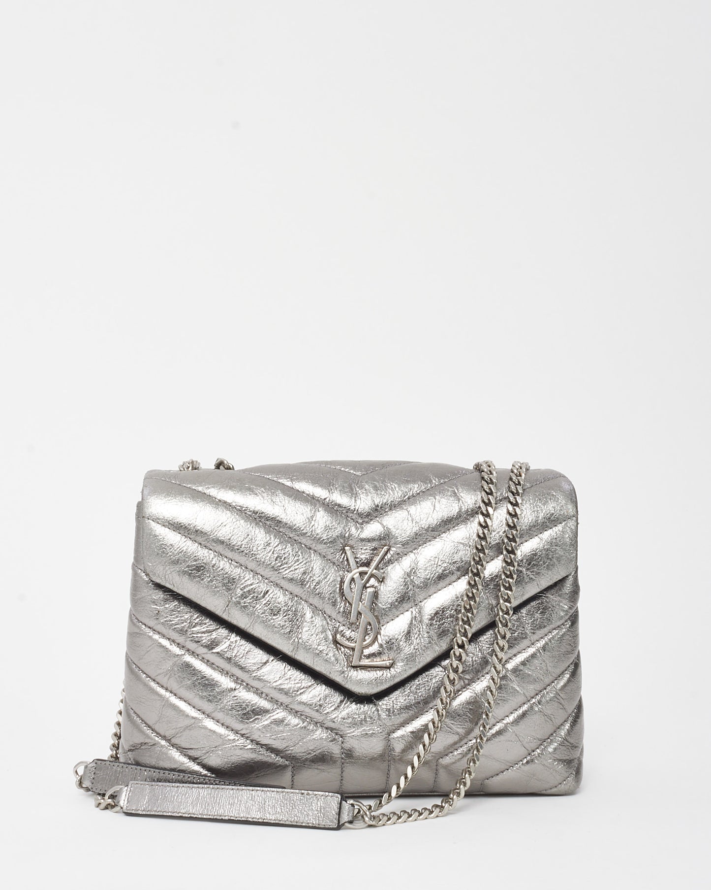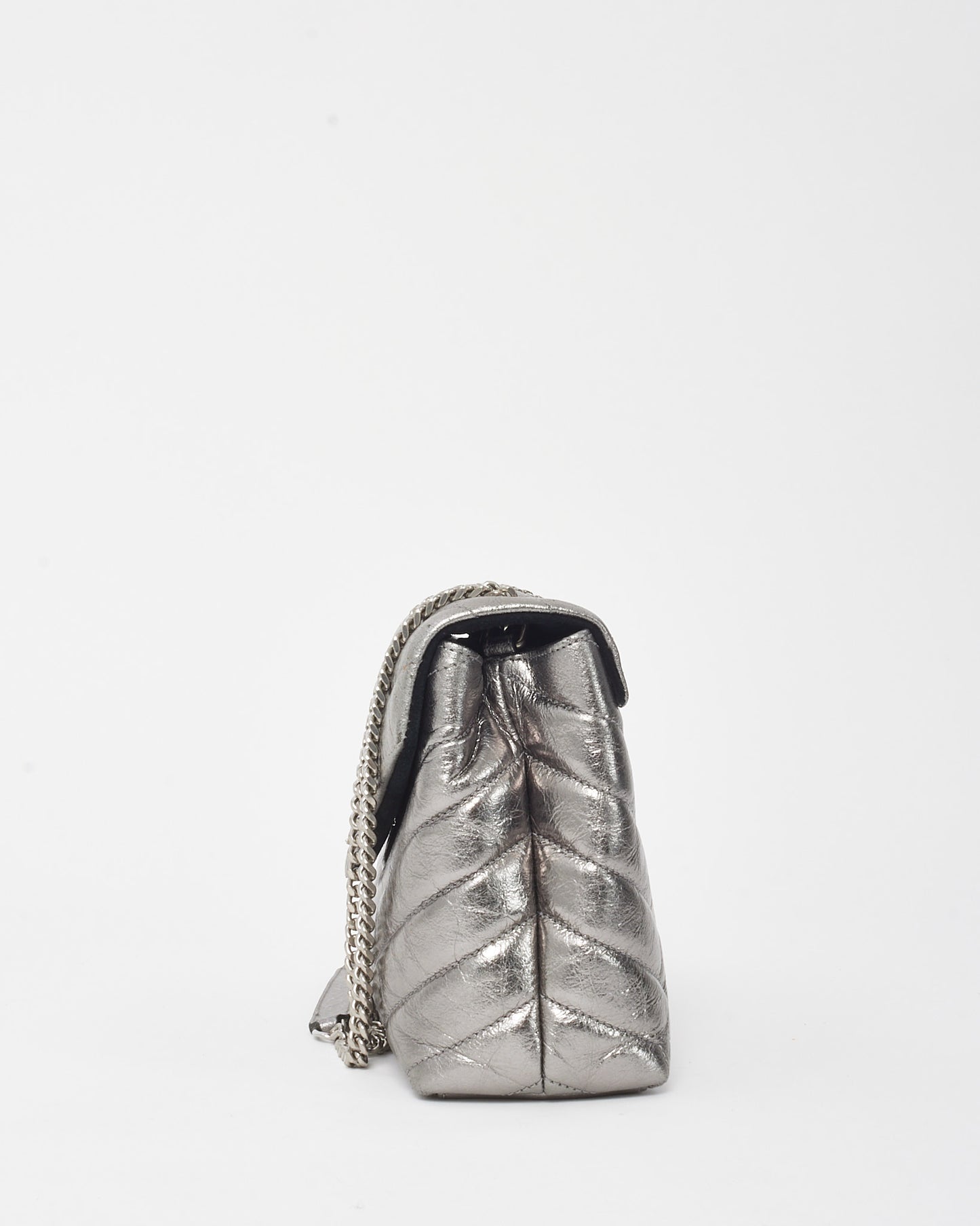 Metallic Silver Leather Small YSL Monogram Loulou Shoulder Bag SHW