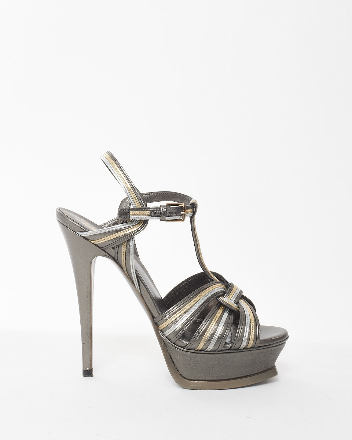 Discover the stunning 100% authentic pre-owned Saint Laurent Metallic Silver Tribute Sandals in size 37.5, a statement piece for any luxury footwear collection. These iconic Tribute sandals feature a sleek metallic silver finish, showcasing Saint Laurent’s signature intertwined straps and a 6" high heel. Perfect for elevating evening looks or adding a bold touch to daytime style, these sandals are a must-have for fashion-forward wardrobes. Shop authentic Saint Laurent footwear at Retyche and step up your style with elegance and edge.