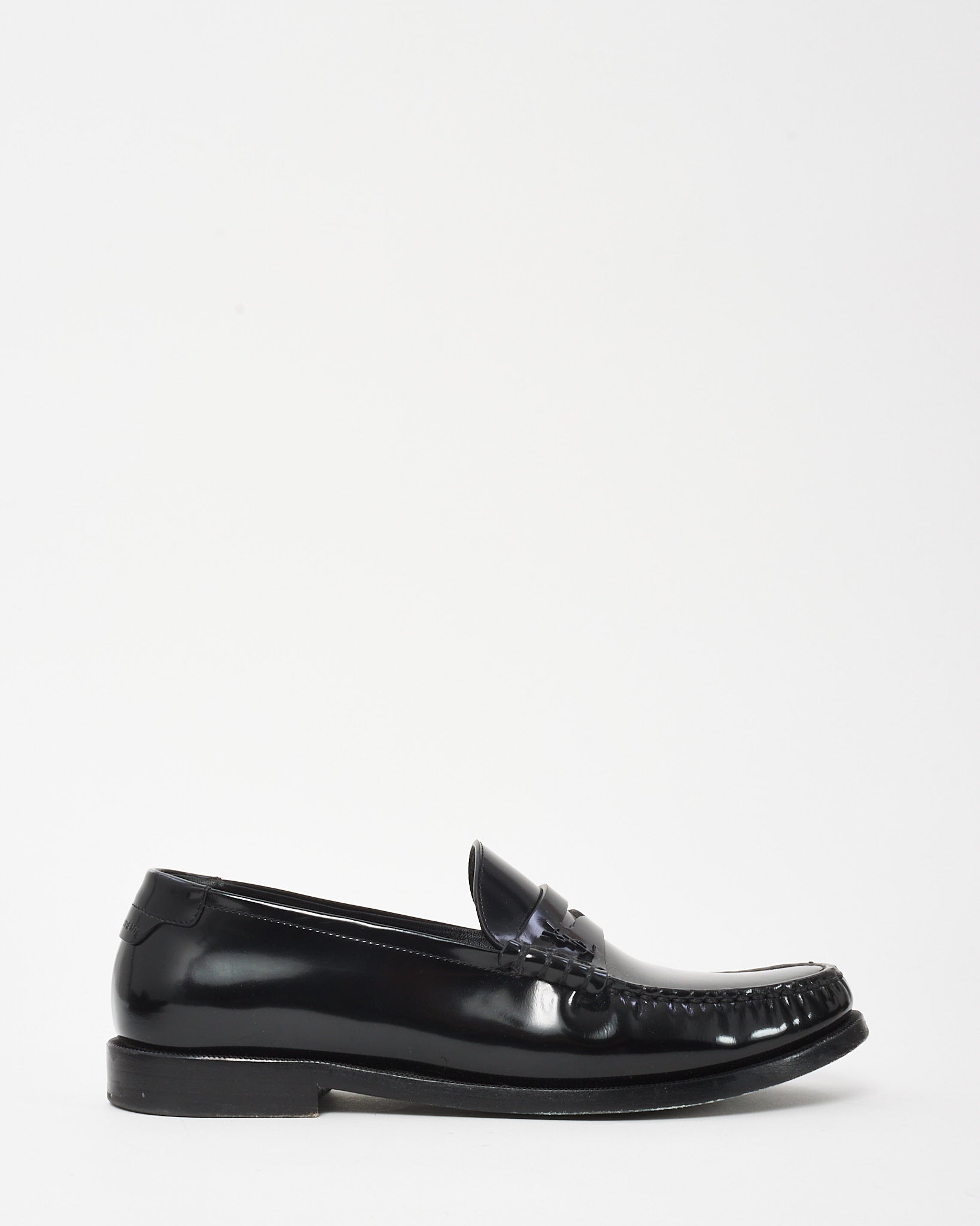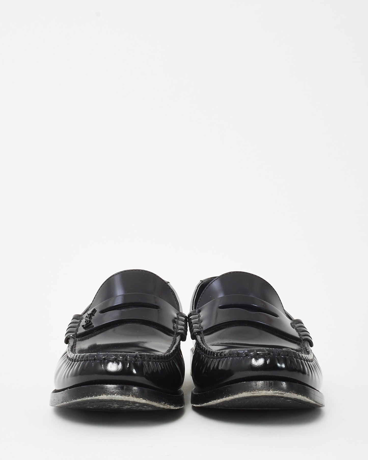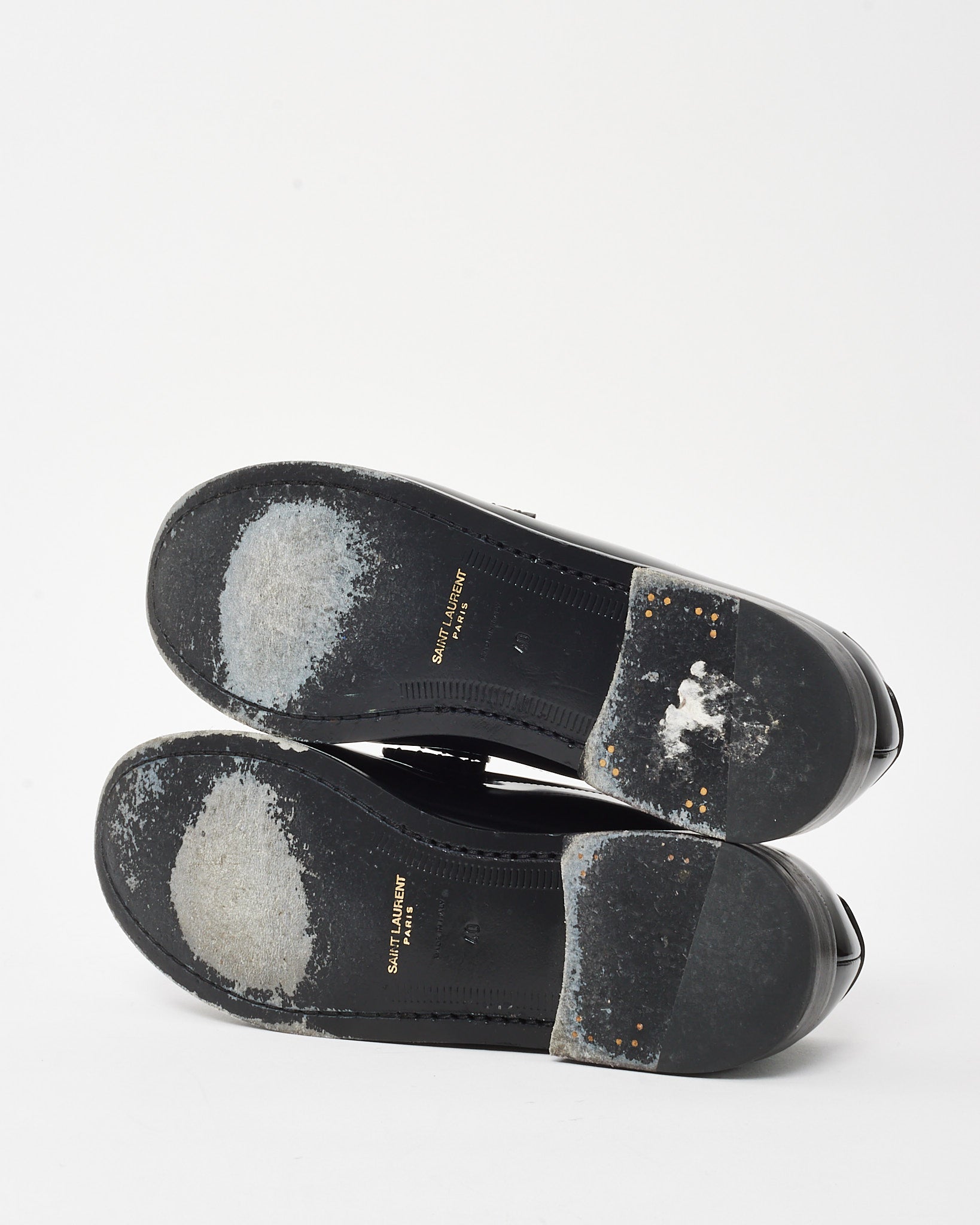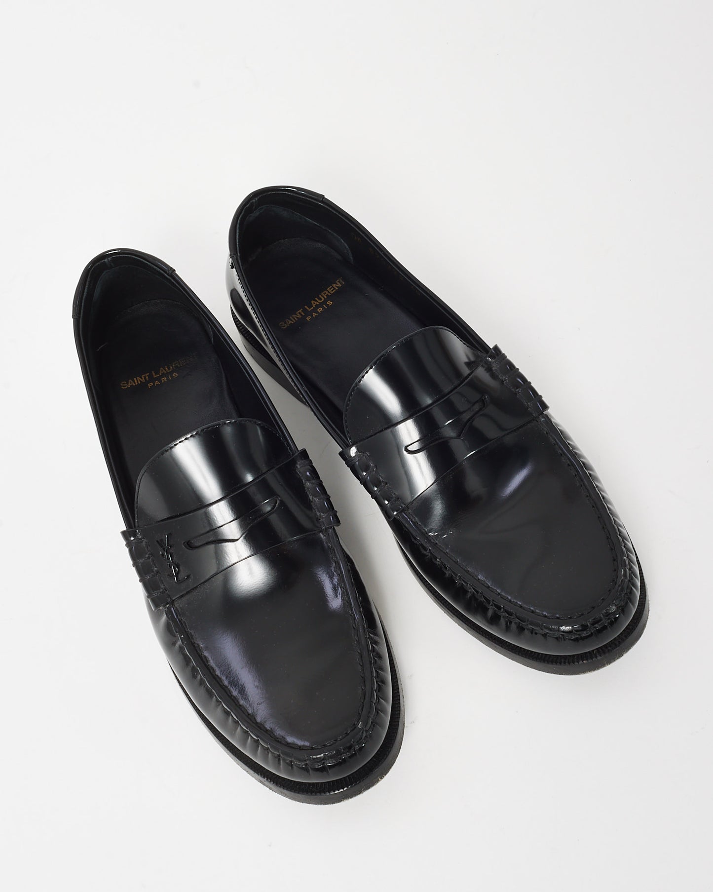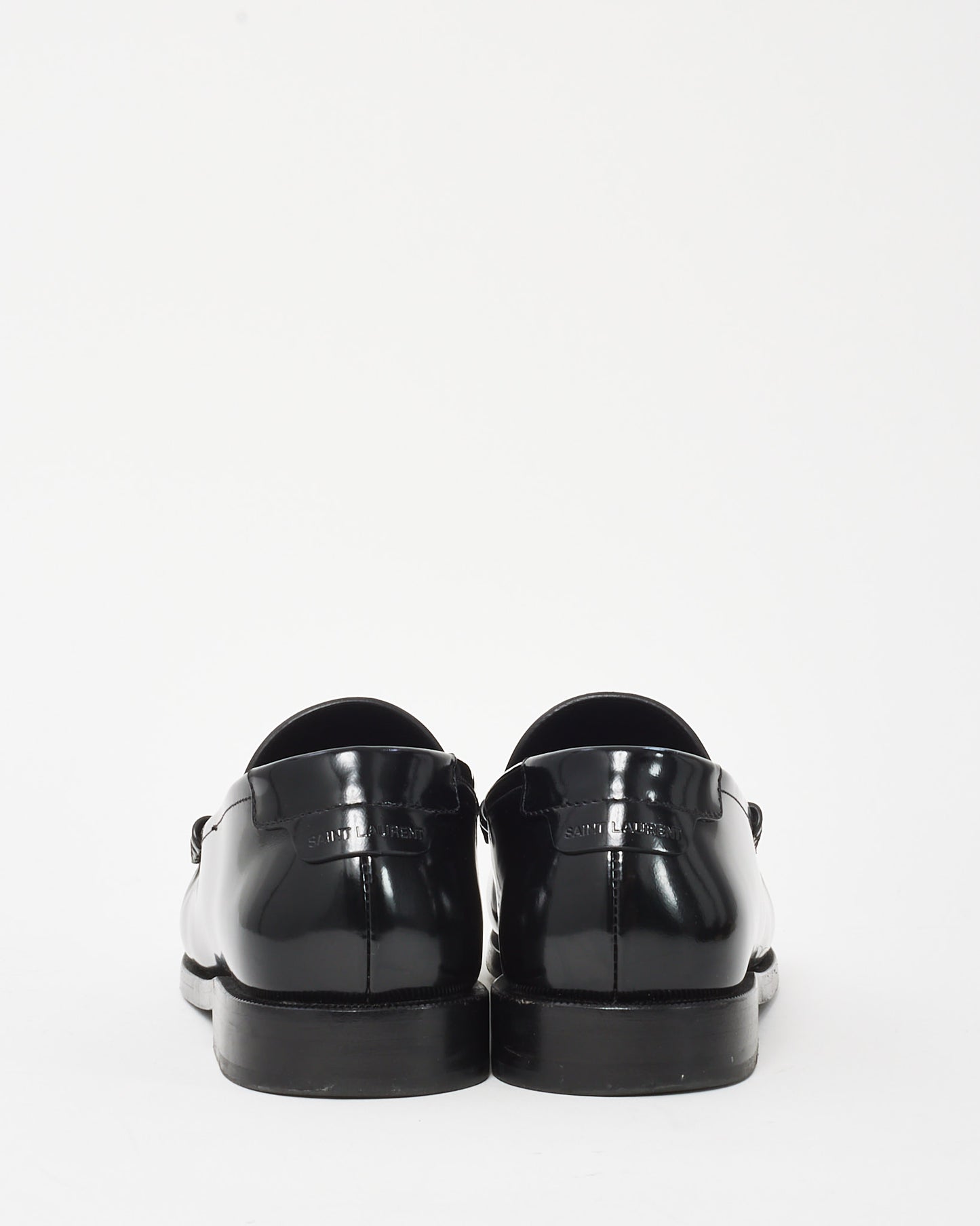 Polished and poised, these pre-owned authentic Saint Laurent Le Loafers are crafted from glossy black leather and detailed with the house’s sleek black-tone tonal YSL logo across the vamp. The timeless silhouette is elevated by fine stitching, a low stacked heel, and luxe craftsmanship for all-day comfort and sophistication.