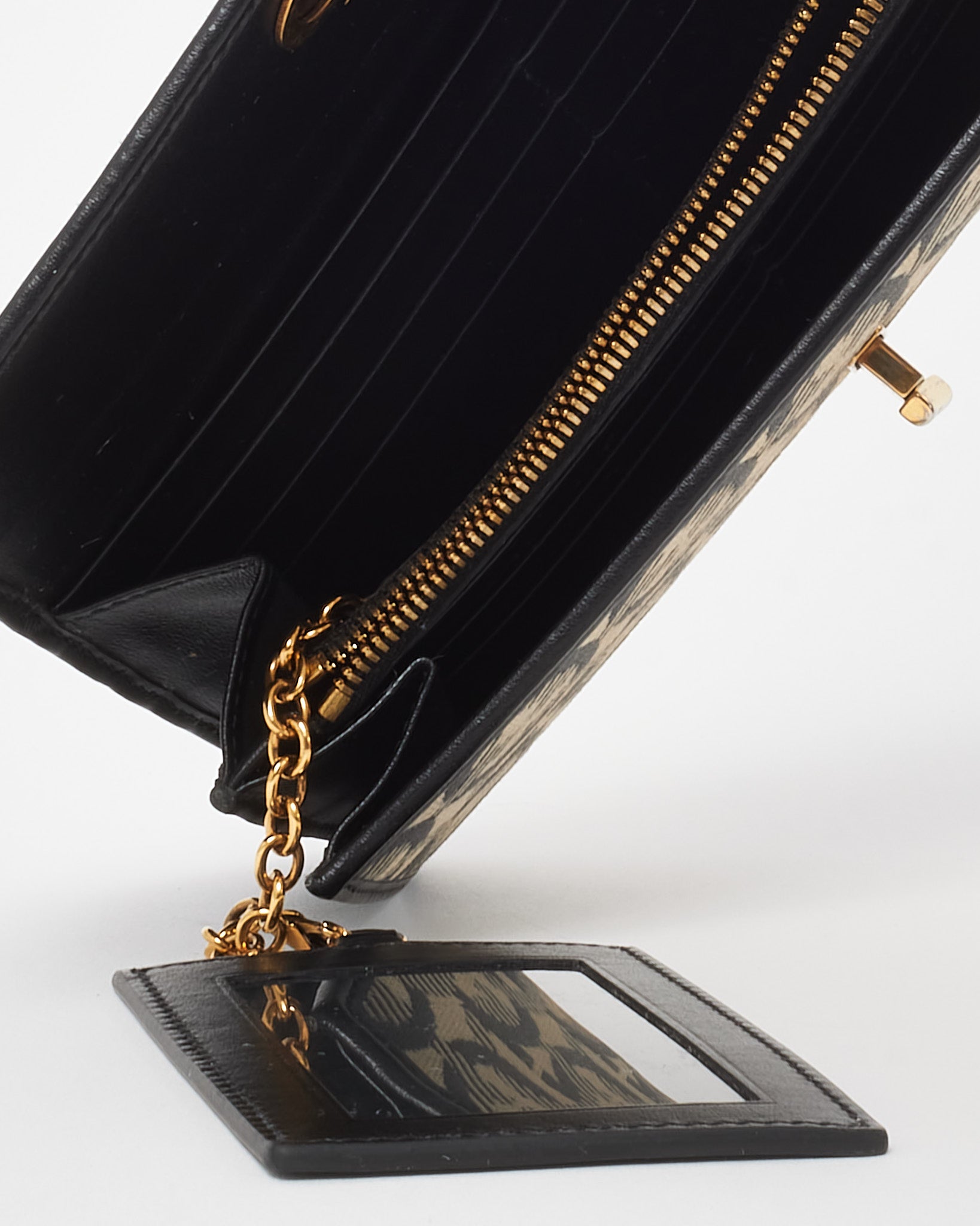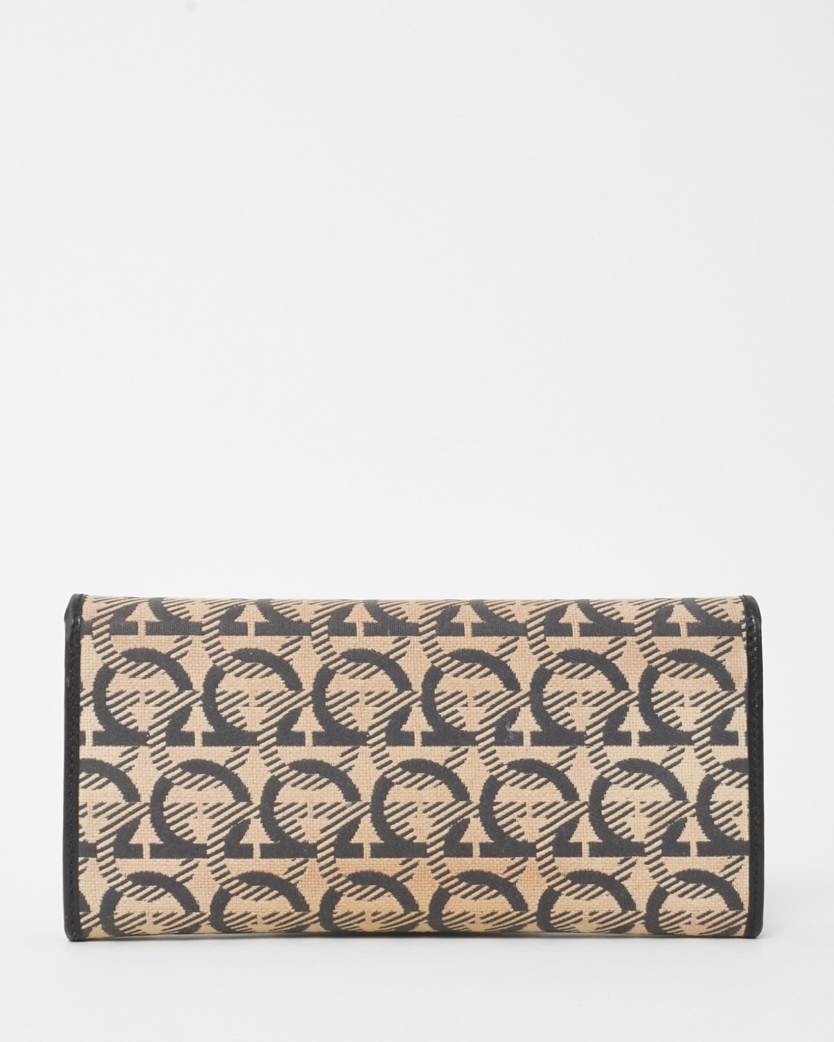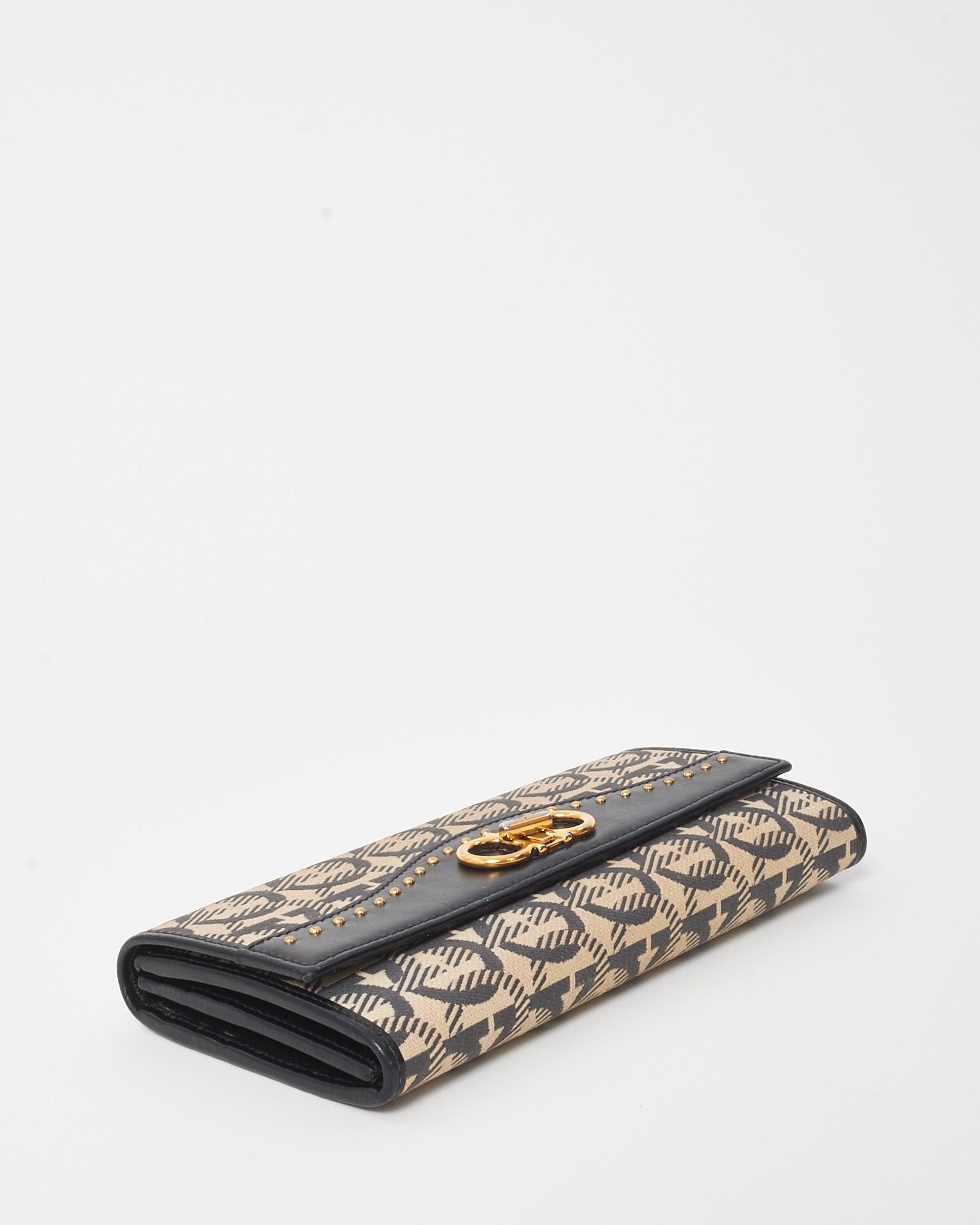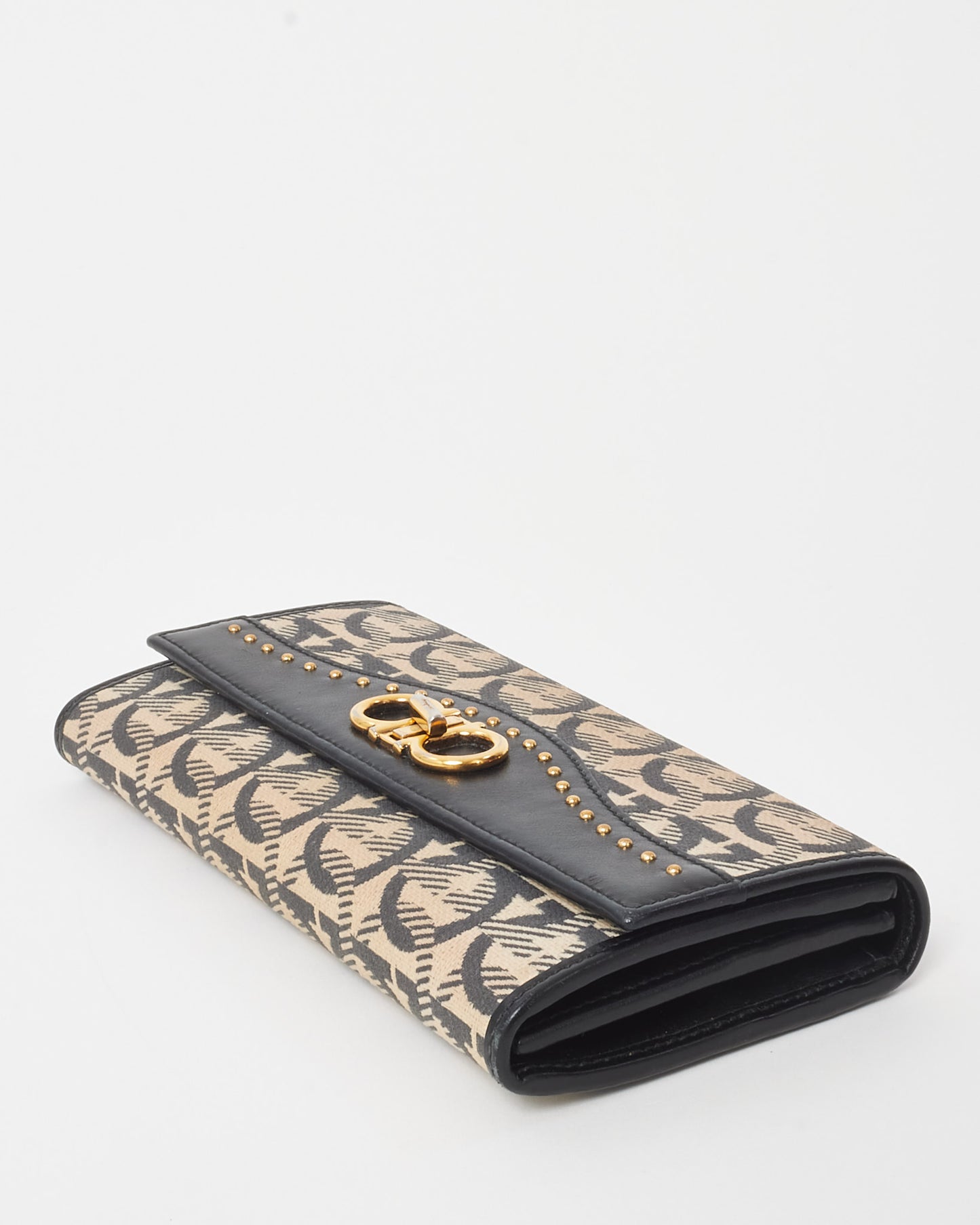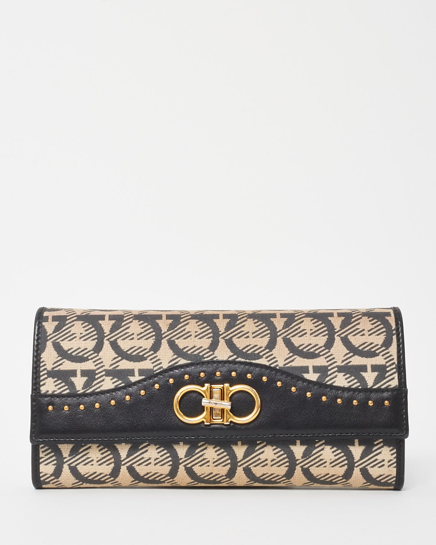 This pre-loved authentic Salvatore Ferragamo Beige Jacquard Fabric and Black Leather Studded Continental Wallet is where refined elegance meets modern detail. Crafted from signature Gancini jacquard canvas and smooth black leather, it’s finished with gold-tone stud embellishments for a bold touch. The spacious interior includes multiple card slots, compartments, and a zip pocket for effortless organization.