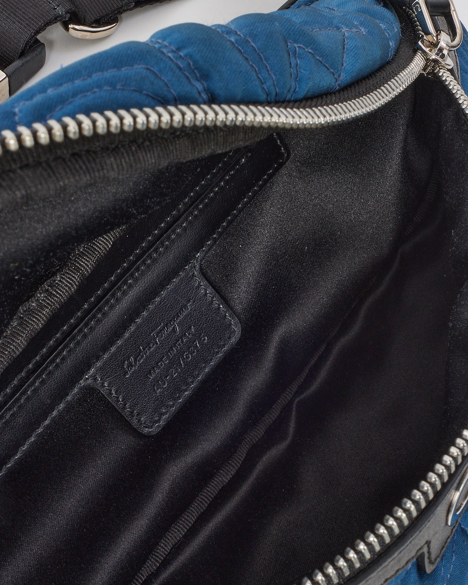 A refined take on utility, this pre-loved authentic Salvatore Ferragamo Belt Bag is crafted in navy nylon with the iconic Gancini logo subtly embossed throughout. Designed for hands-free convenience, it features a zip-top closure, adjustable belt strap, and leather trim for a sleek, elevated finish. A practical yet polished essential for everyday wear or travel.