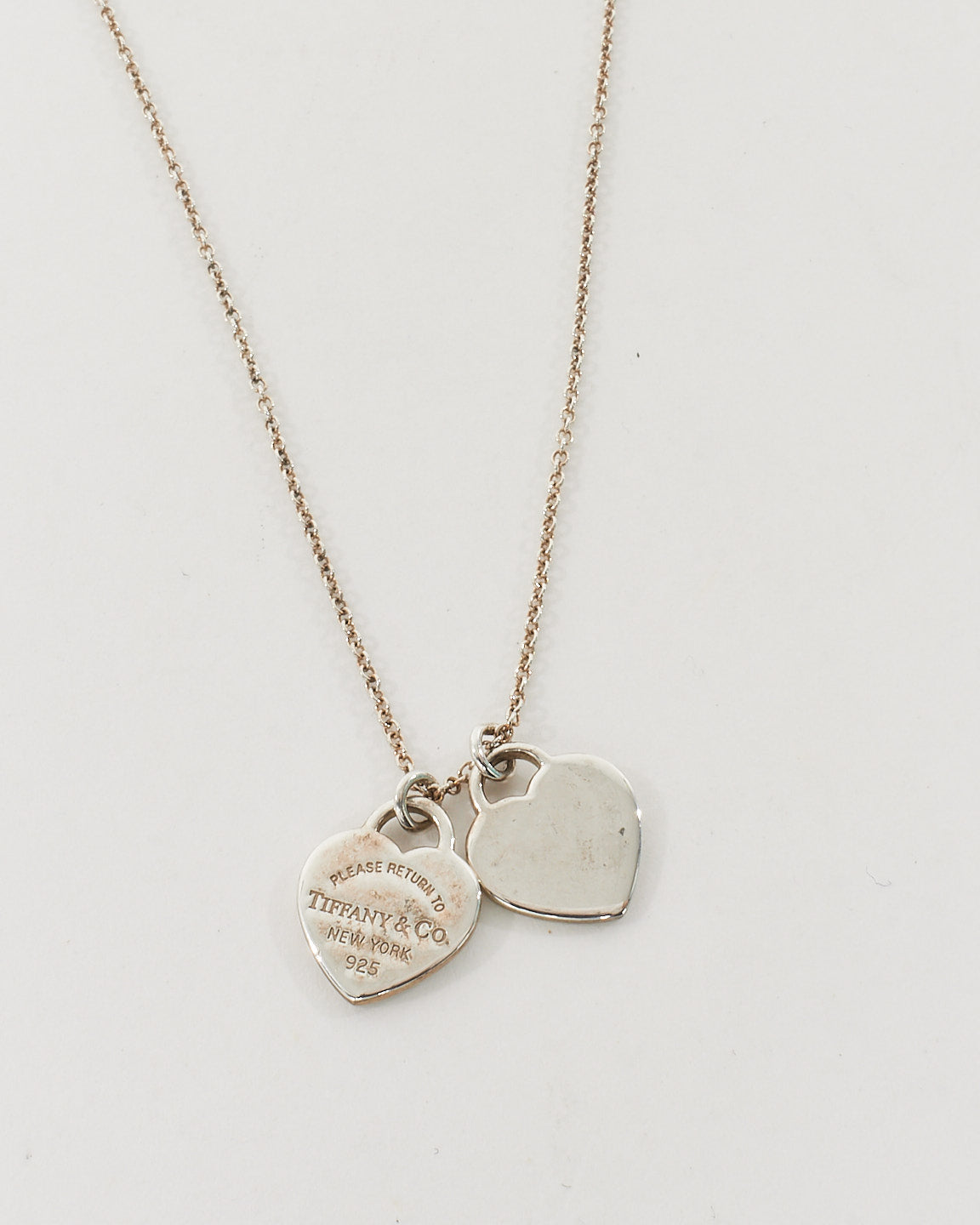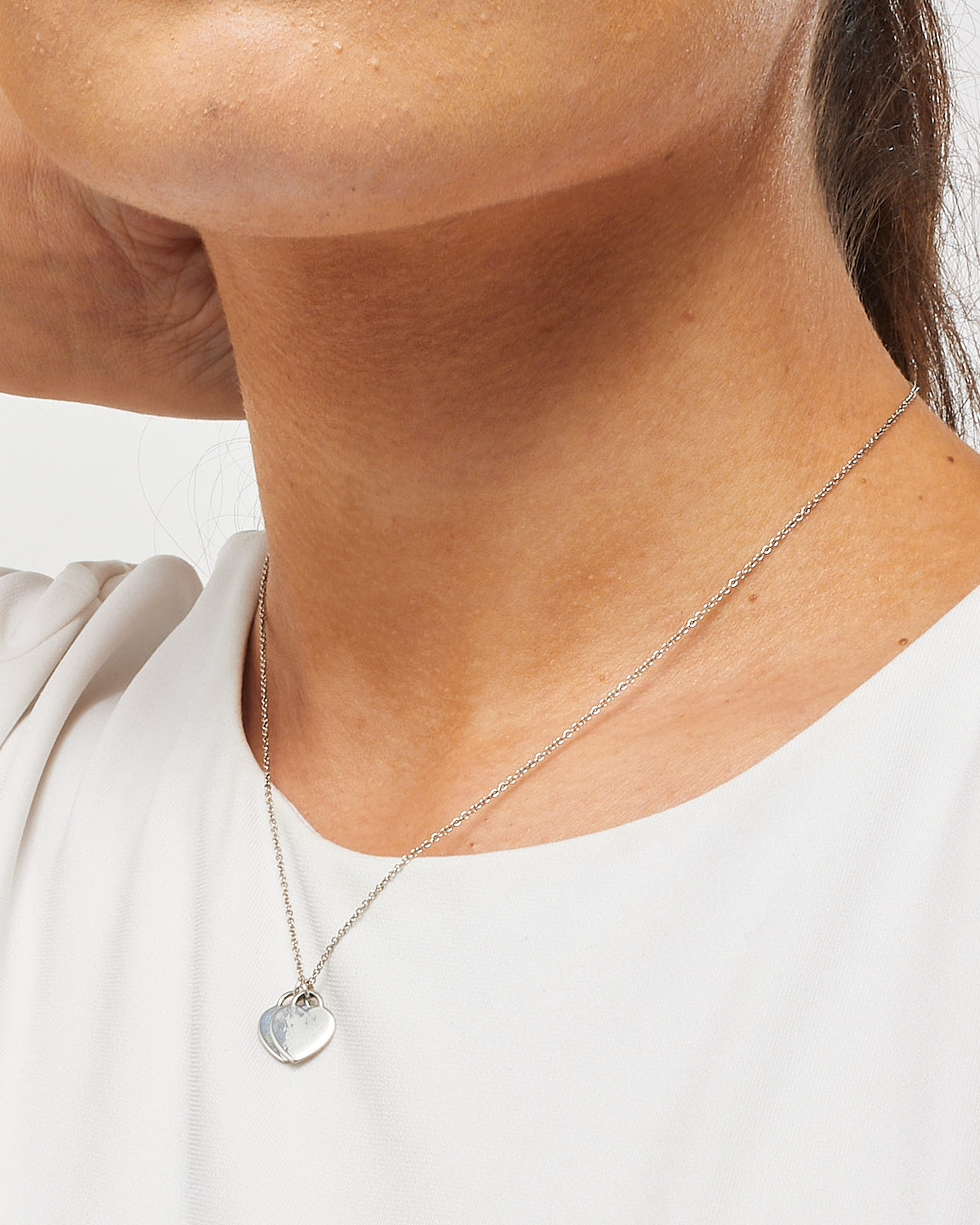 Delicate and iconic, this pre-owned authentic Tiffany & Co. Silver Mini Double Heart Tag Pendant Necklace captures timeless elegance in the brand’s signature style. Featuring two interlocking heart charms — both in polished sterling silver — it’s a sweet yet sophisticated symbol of love and legacy.