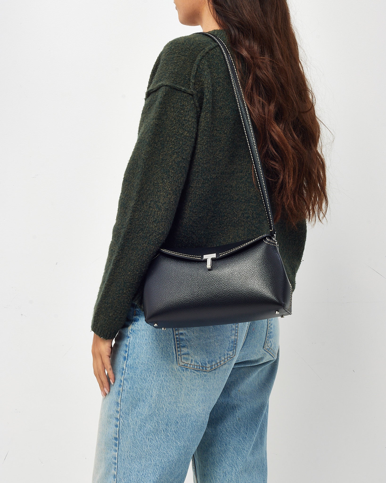 Black Leather and White Stitching T-Lock Clutch Bag w/ Strap