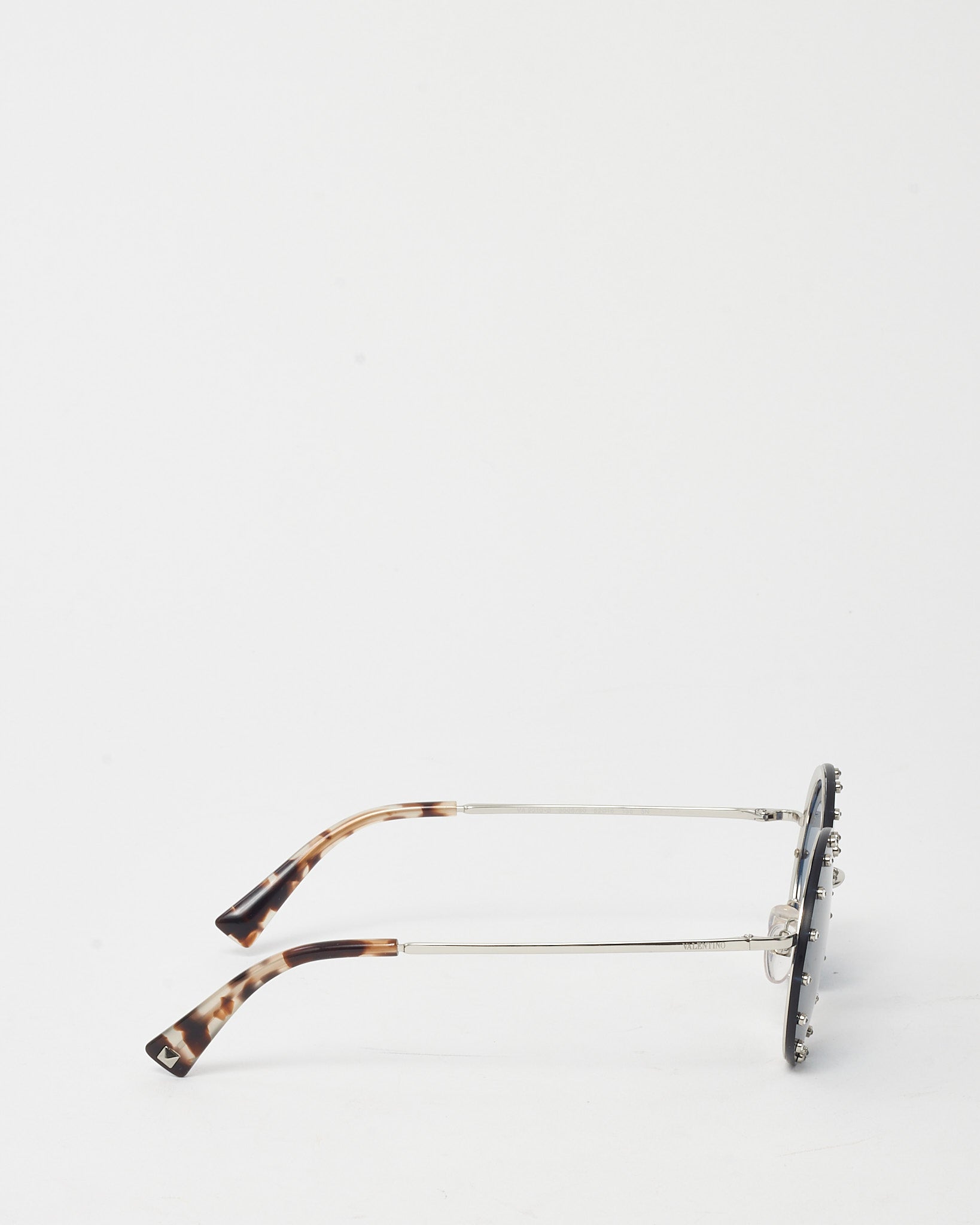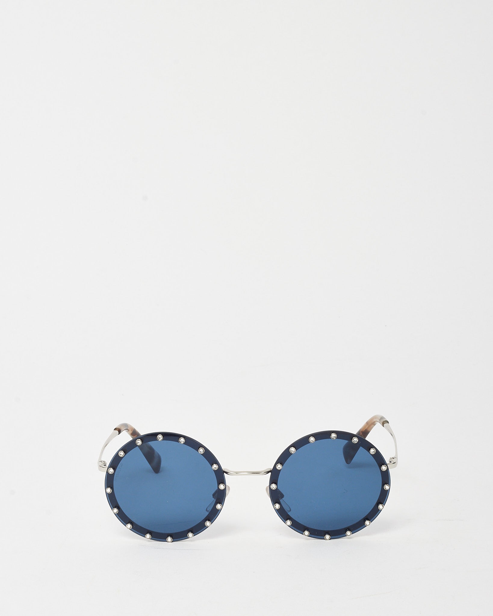 Add show-stopping glamour to your eyewear collection with these pre-loved authentic Valentino Black/Blue Lens Rhinestone Crystal Embellished Round Sunglasses VA2010/B. Designed with oversized round frames, these bold sunglasses feature black acetate rims adorned with shimmering crystal embellishments for a luxe, high-fashion finish. The cool blue gradient lenses provide full UV protection, while the Valentino branding at the temples adds a signature touch. Perfect for making a statement on sunny days or elevating any outfit with sparkle and edge.