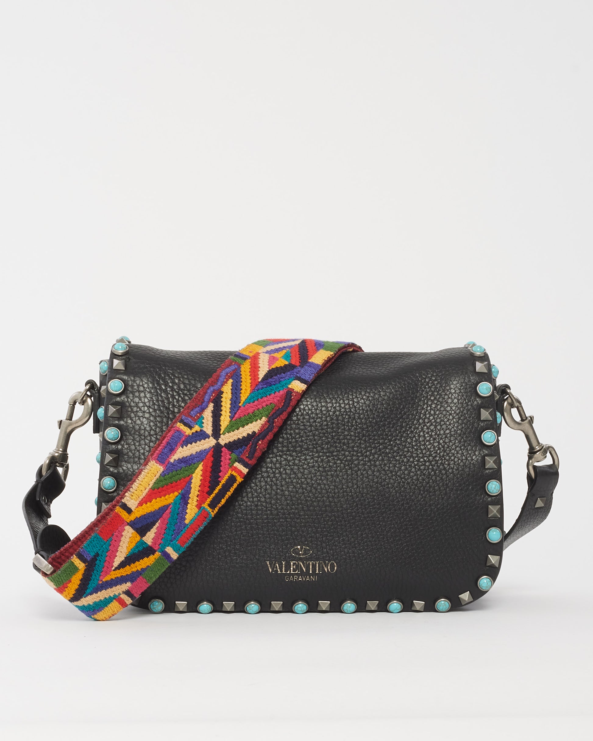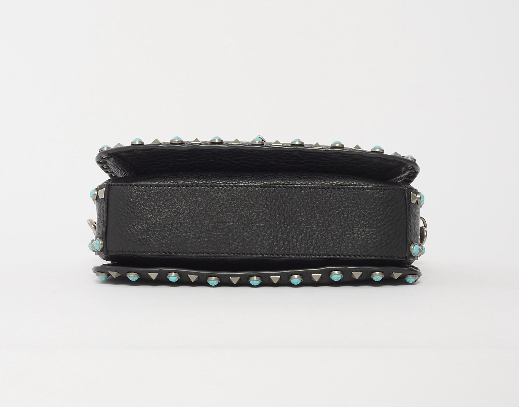 Black Calfskin Turquoise Guitar Strap Rockstud Medium Rolling Flap Bag