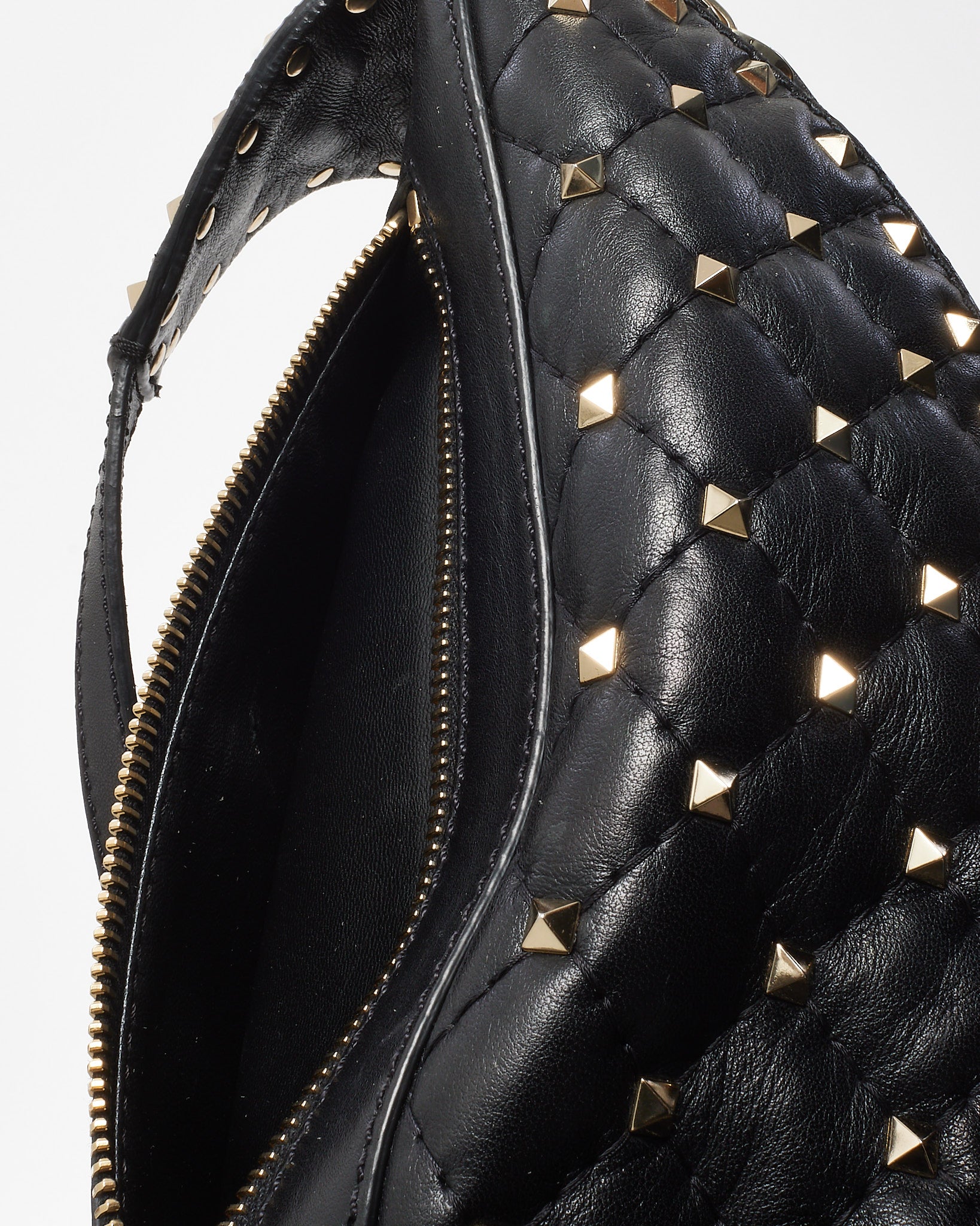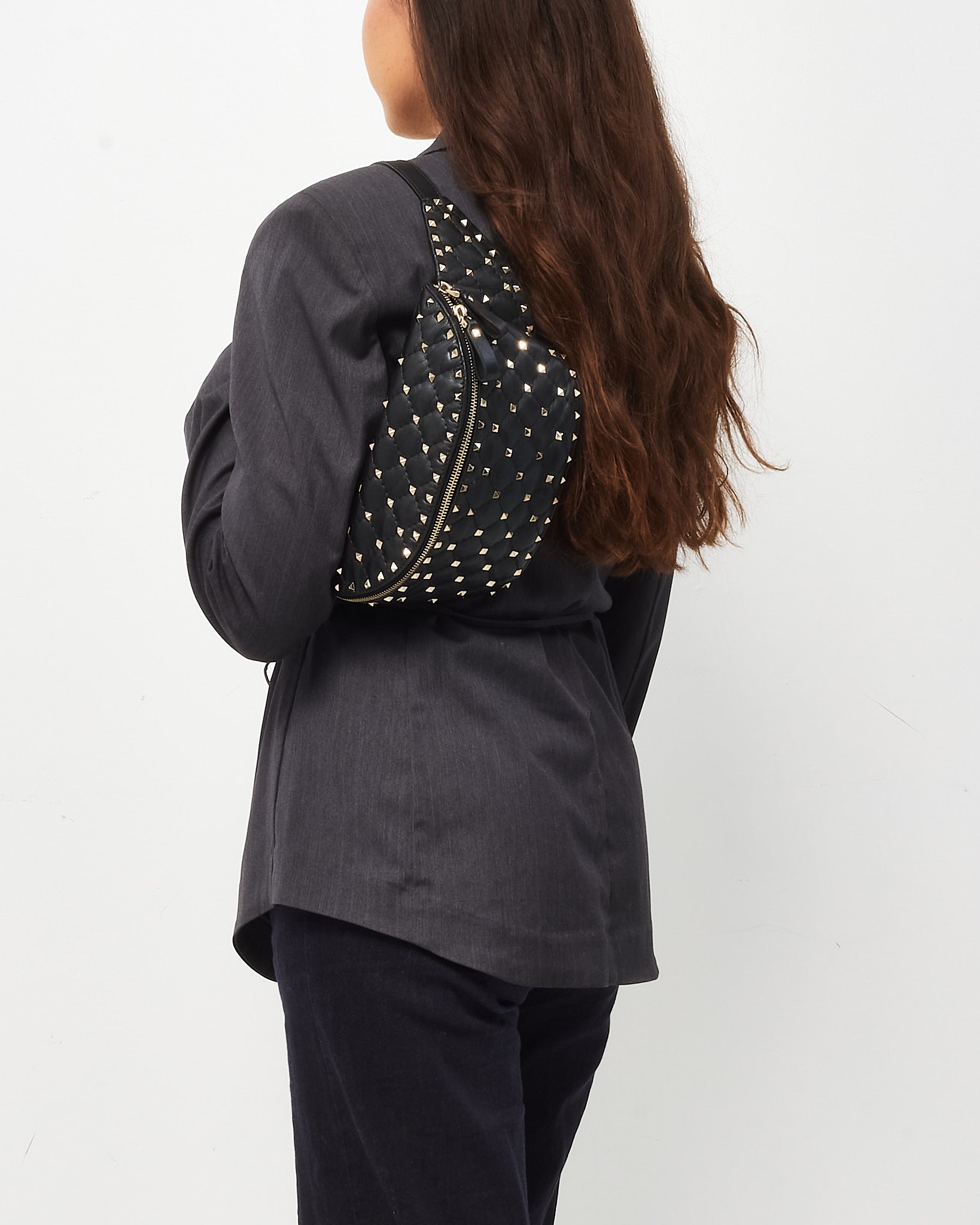 Merging edgy sophistication with everyday functionality, this Valentino belt bag is crafted from supple black nappa leather and elevated with the house’s iconic Rockstud quilting. The sleek, structured silhouette wraps effortlessly around the waist or hips, secured by an adjustable strap with a buckle closure. Antique gold-tone studs add a bold touch of signature glamour, while the top zip opens to a compact interior—perfect for stowing essentials hands-free. Ideal for travel, city strolls, or adding a refined edge to casual looks.