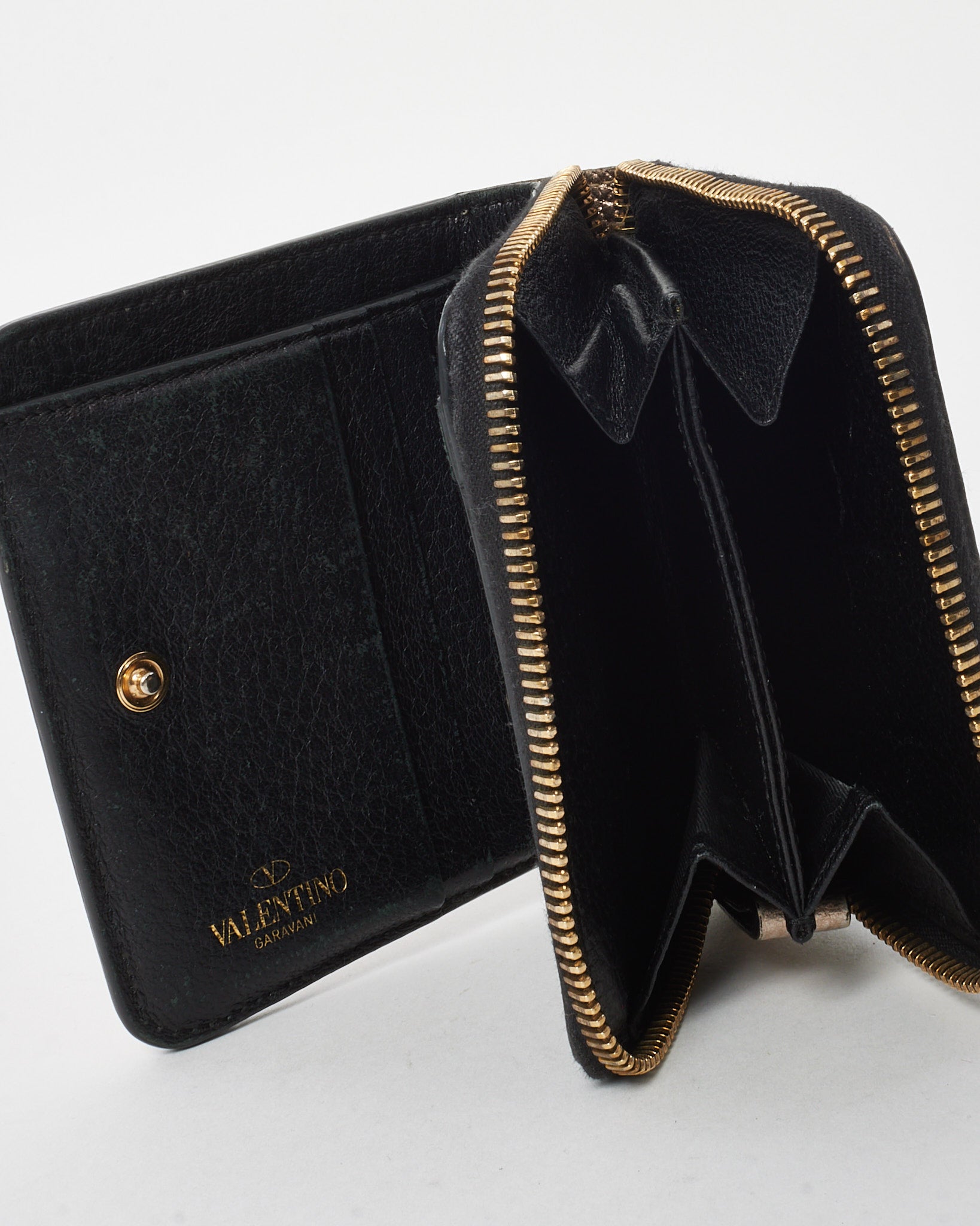 A refined statement of luxury, this pre-loved authentic Valentino Rockstud Zippy Compact Wallet is crafted from metallic gold pebbled leather and finished with the brand’s iconic pyramid studs for a bold yet timeless edge. Featuring a secure zip-around closure, multiple card slots, and an organized interior, this compact design offers both style and functionality. Perfectly sized to slip into your favorite bag, it’s a chic everyday essential for the modern Valentino lover.