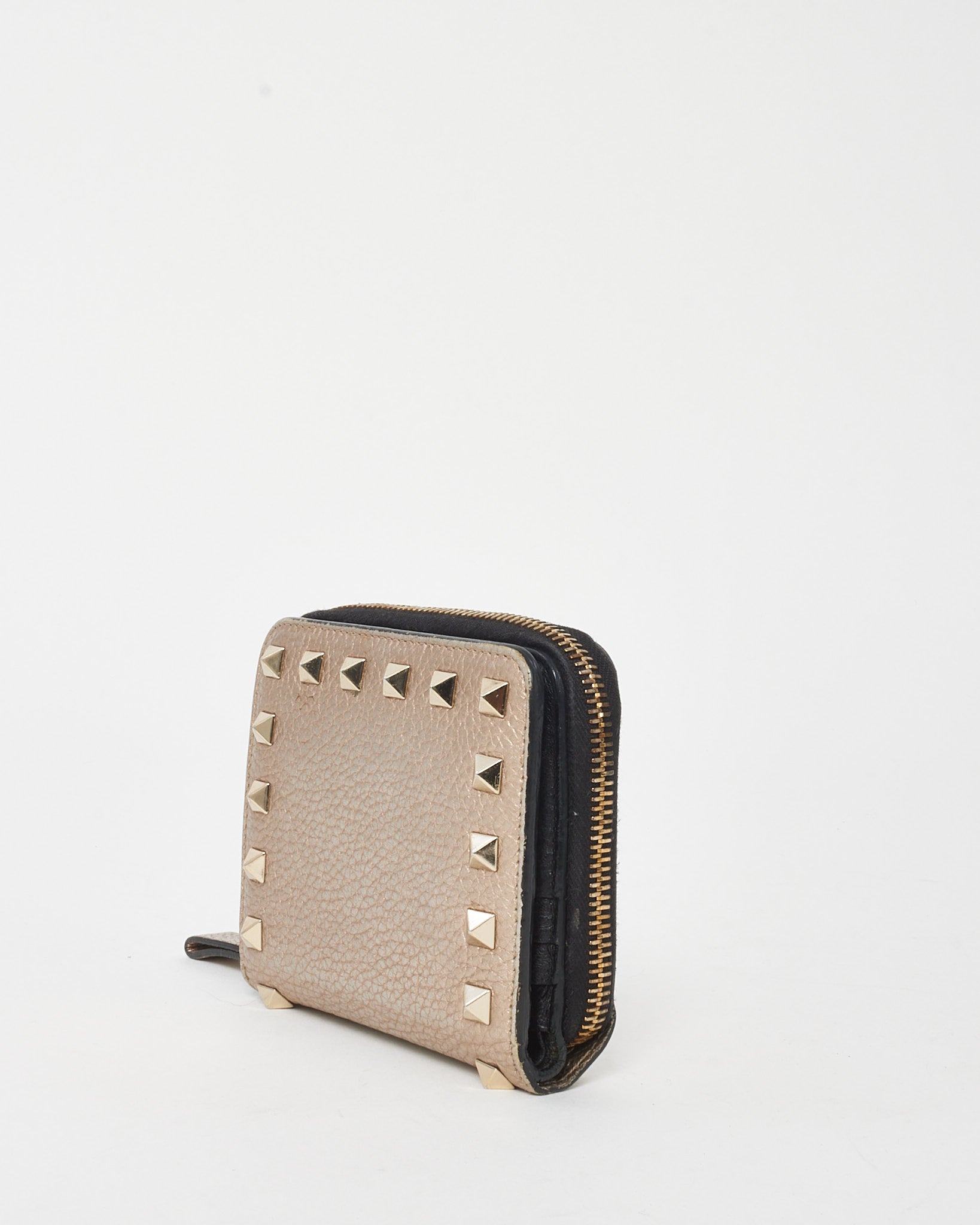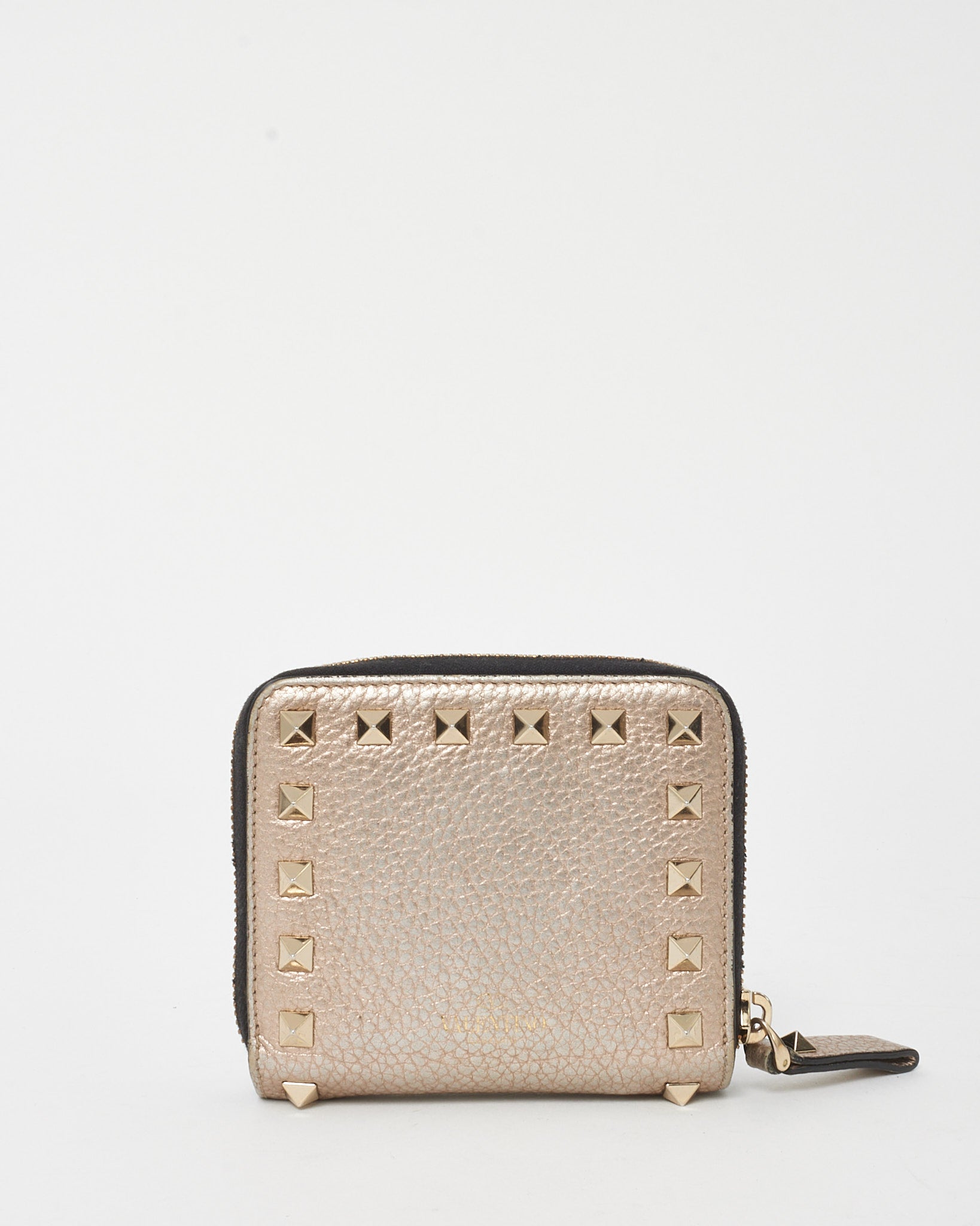 Metallic Gold Pebbled Leather Rockstud Zippy Compact Wallet