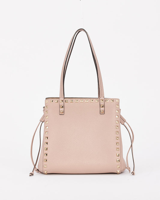 Pink Grained Leather Rockstud Drawstring Bucket Shoulder Bag