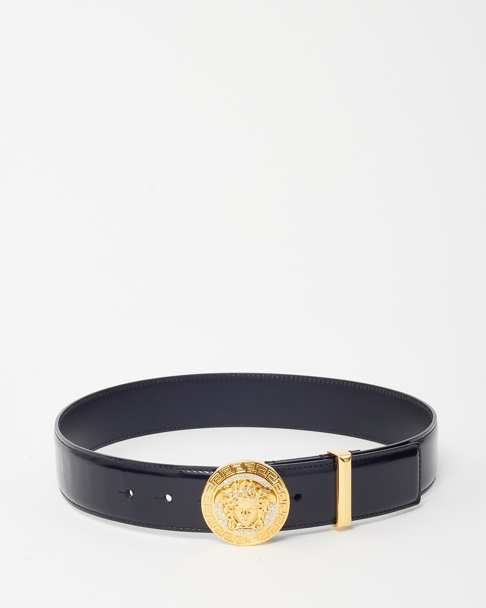 Chic and bold, this pre-loved authentic Versace Black Leather La Medusa Crystal Palazzo Belt adds a touch of luxury and glamour to any look. Crafted from smooth black leather, it features the iconic Medusa head buckle adorned with shimmering crystals for a statement finish. The sleek design and adjustable fit make it perfect for pairing with dresses, trousers, or outerwear. A timeless Versace accessory that embodies Italian sophistication and modern elegance.