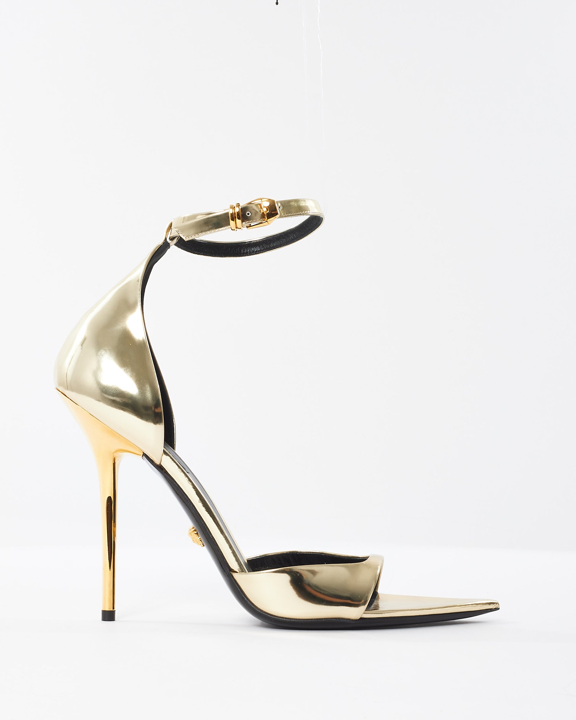 Explore Versace's exquisite collection of shoes, featuring this certified pre-owned Gold Pantent Leather Ankle Strap Stiletto Sandals. Embodying timeless elegance and modern sustainability, each piece, including favorites like this, is authenticated by Retyche. Discover sustainable luxury — shop our current treasures or find inspiration for your next coveted find.