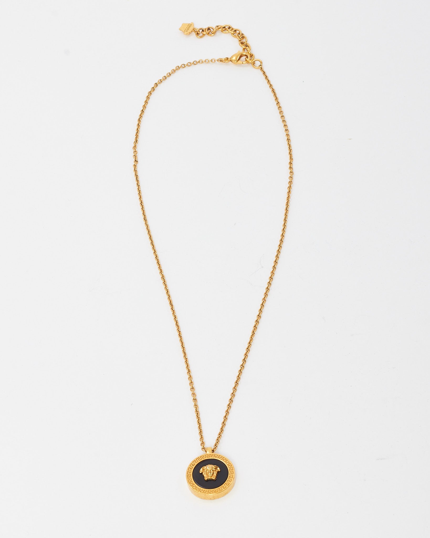 Make a statement with this pre-loved authentic Versace Gold Metal and Black Medusa Head Circle Pendant Necklace. Featuring the iconic Medusa emblem set against a bold black enamel backdrop, this striking pendant hangs from a polished gold-tone chain. The Versace Gold Metal and Black Medusa Head Circle Pendant Necklace brings signature house glamour and edge to both casual and evening looks.